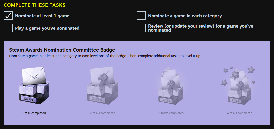 You can get further involved in the Steam Awards nominations to level up your Committee Badge and earn XP. Don’t forget to nominate a game in each category, play it, and review (or update your review) for a game you’ve nominated.