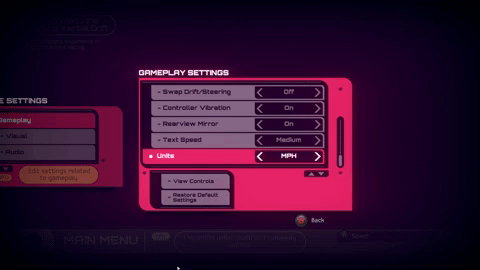 Swap between KPH and MPH, toggle the rear view mirror and customise your drifting experience in the gameplay settings menu. You can even invert the twin-sticks!