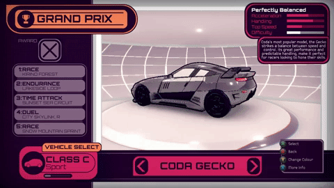 The cars in Inertial Drift are designed to evoke classic 90’s sports cars and tech - with futuristic qualities in keeping with the 90s-retro-future setting! Now, each car comes in a choice of 8 retro-inspired colourways as well as their original liveries.