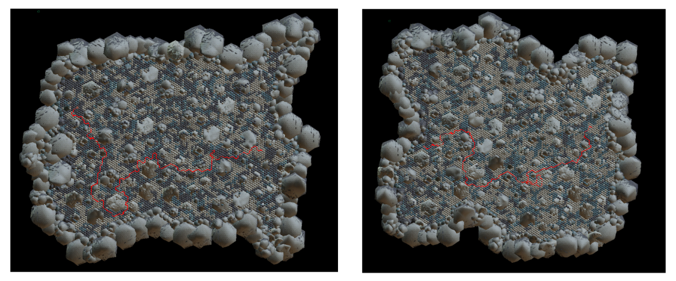 Now let’s talk about the random mountains. The experience from creating handcrafted mountains came in handy when switching to complete randomness. With this type of generation, we can create an almost endless number of mountains. The difference to the handcrafted mountains and the combination of smaller random areas are that we now use a whole map for each level, which is created only by parameters and will change with every build. These two Pictures are the same mountain which built two times differently.
