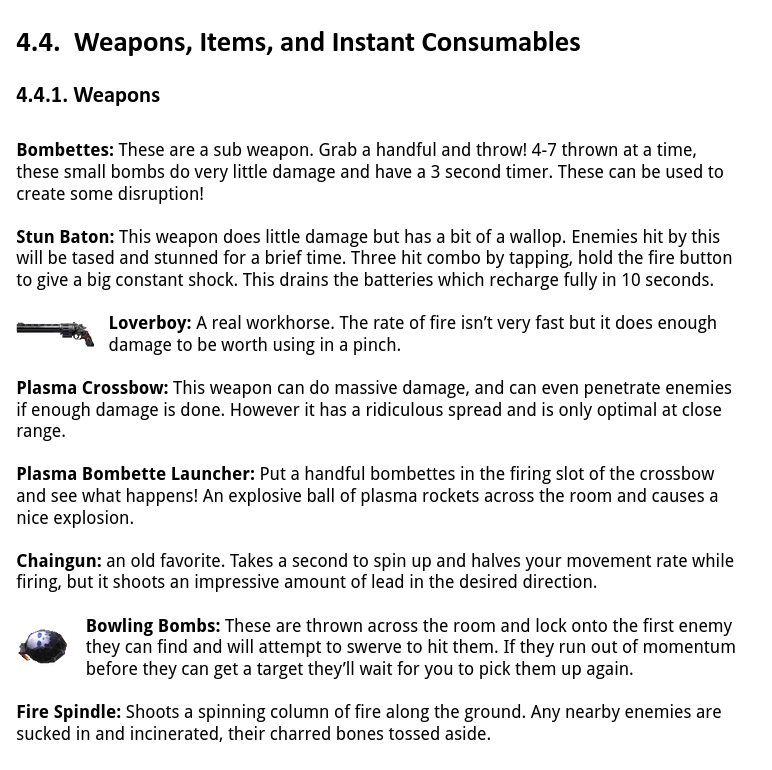When level designers wanted to require a certain weapon such as explosives, or highlight a certain style of combat, they were asked to place the weapon and some ammunition for it beforehand. They were also asked to restock the player after every autosave point, in order to refresh themselves from the hard work of getting there. Level Designers were otherwise discouraged from forcing players to stick to only one weapon by not giving enough ammo variety. Every weapon is useful, with a unique set of advantages and disadvantages that can be twisted to fit different combat situations. Even the starting pistol, the Loverboy, and your baton–the Electrifryer–can be used with great effect throughout the entire game (fun fact: big enemies are weak to it!).
