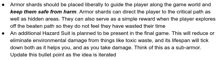Second, since Armor Shards make players feel safer they would be used as breadcrumbs to guide you through the level. With a small nod to the designs from classic games like Super Mario Bros., major path points or important areas had them placed in distinct lines in order to push you in the next direction subconsciously. The more suggestions we made with shards, the more players were able to find the critical path without even trying.