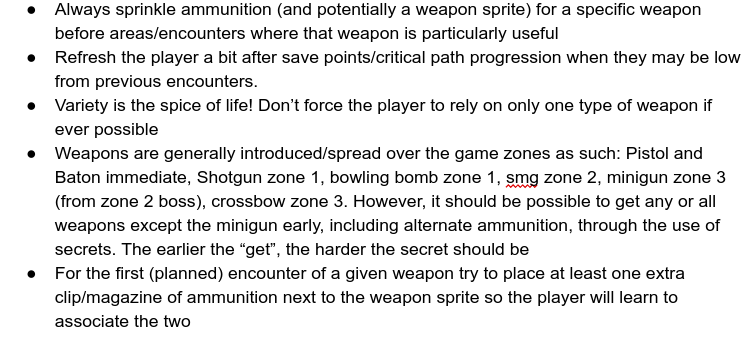 Weapons which were meant as critical to progression were to be placed in obvious, well lit locations and positioned in a way that best attracts attention. Ammo for that weapon would appear near it so you could start to associate the two. Then a scenario where that weapon is useful would appear after, and players could learn a bit about how it works.
