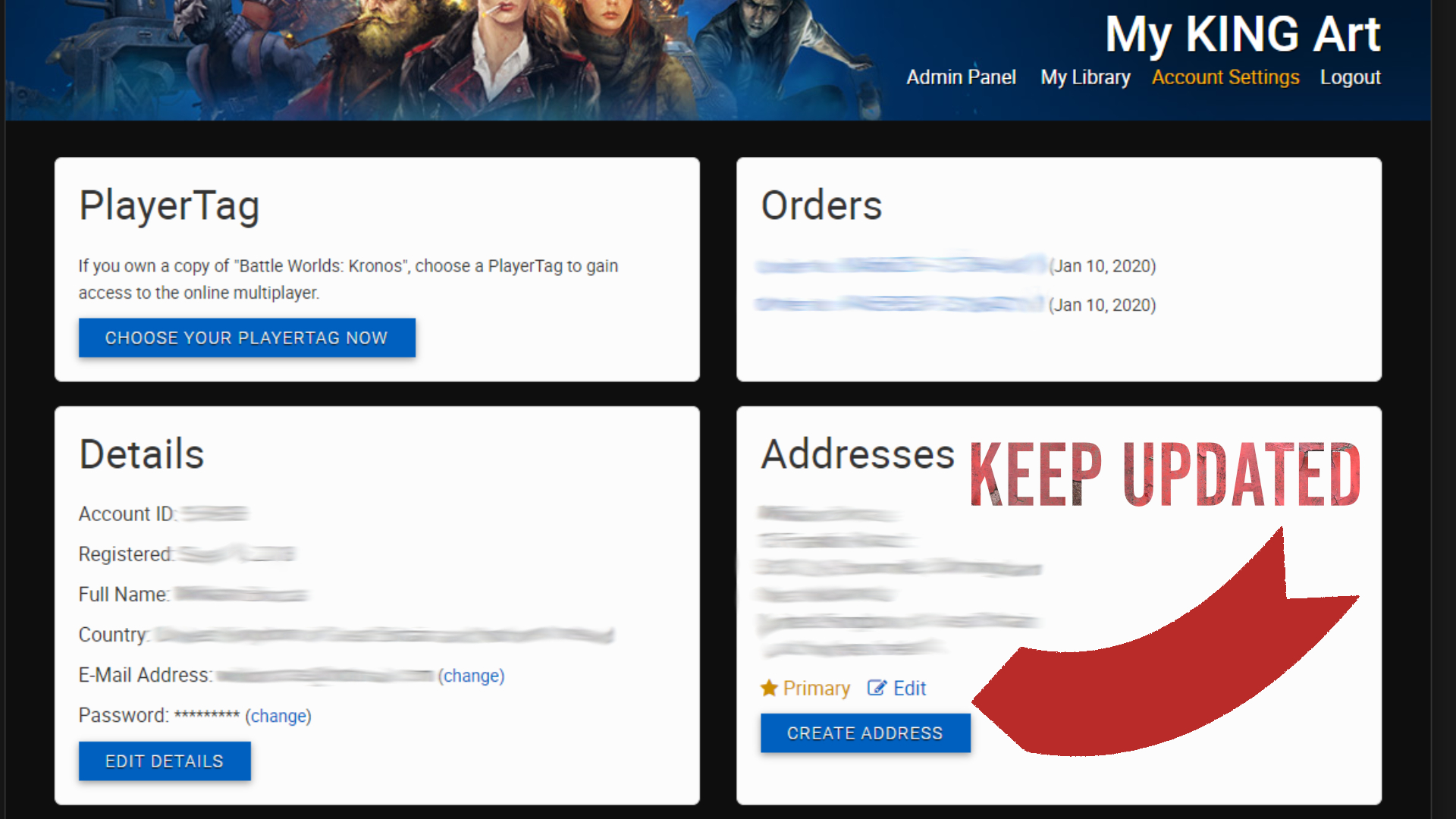 We know it’s been a long wait, as world events have conspired against us, but we are getting close to being able to ship out the Backers physical rewards. Just make sure your shipping address is up-to-date [url=https://kingart-games.com/account][b]here[/b][/url].