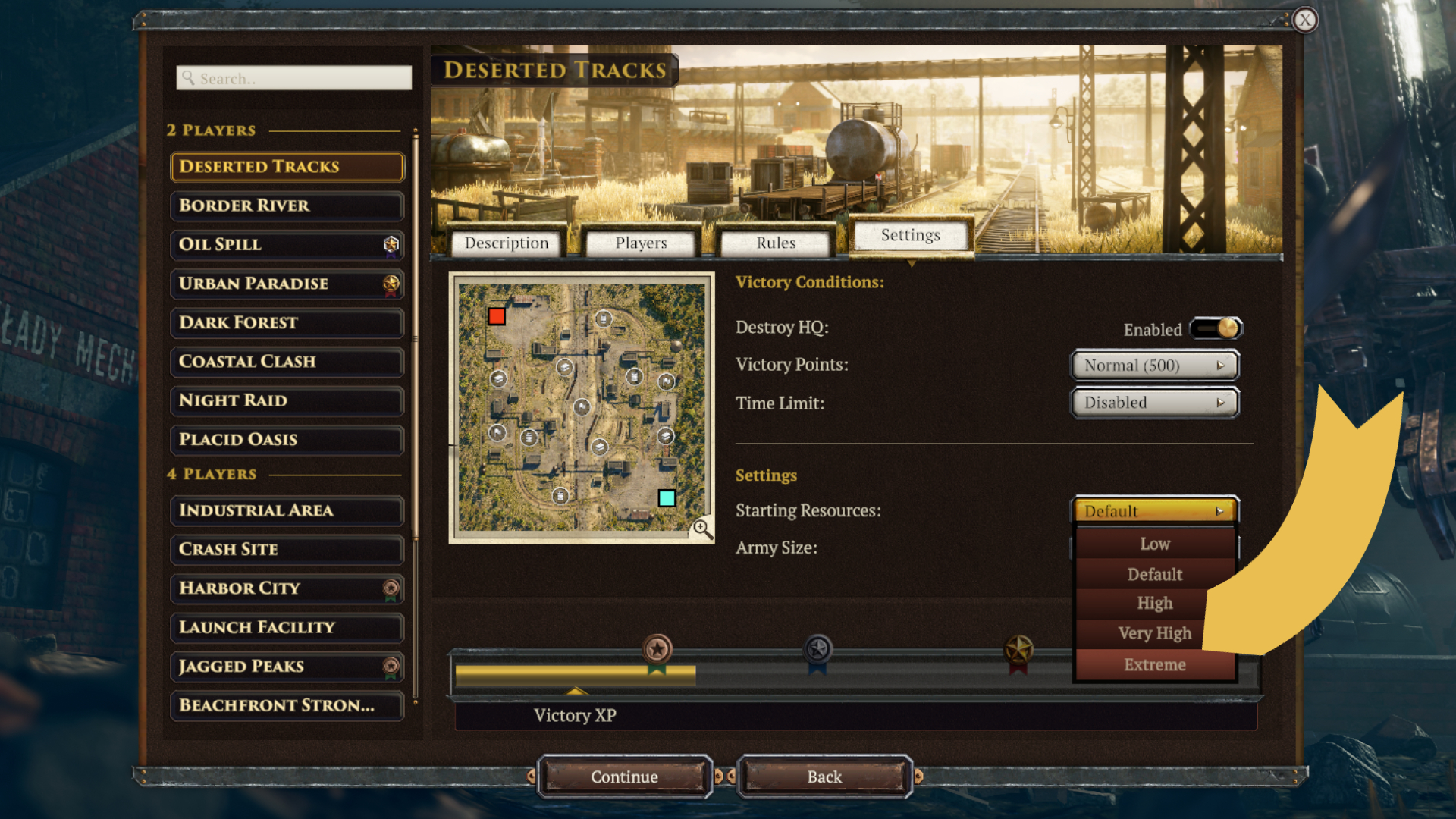 - Extreme starting resources can now be selected when setting up Skirmish, Multiplayer and Custom games so you can dive right into the mechanized mayhem.