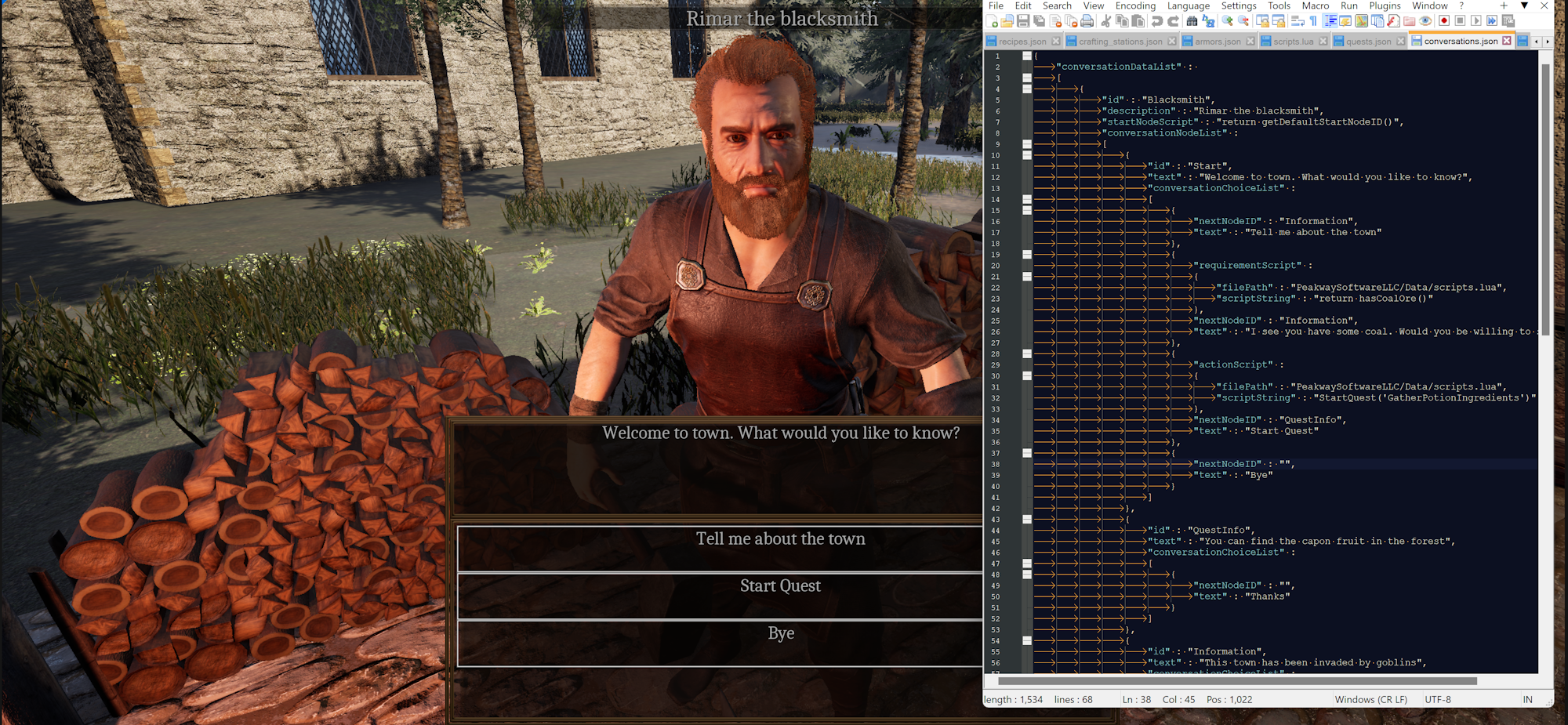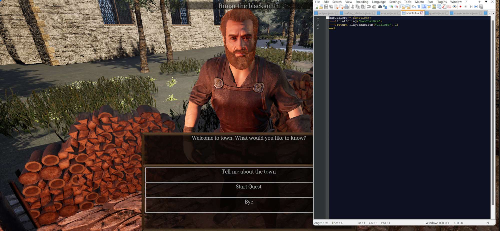 This shows the LUA code that can be called. Still a lot to do but LUA code will be used for conversations (determining what options and nodes can be seen, actions that occur), and quests. Also interactable objects and triggers.