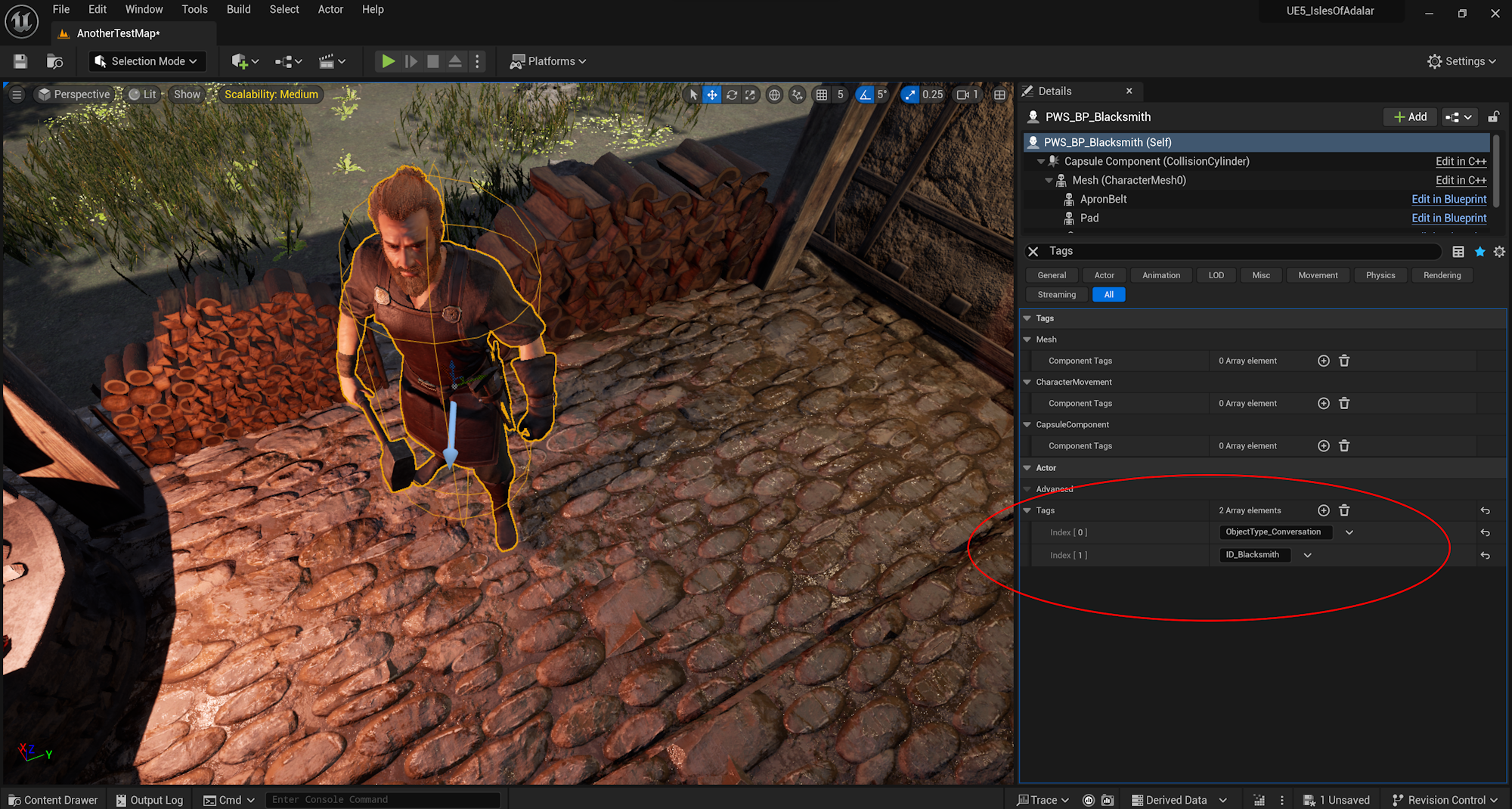 The way JSON information is associated with objects in a level are through Unreal's tag system. For this NPC it has a tag for the type of Object it is (in this case it support conversations) and the ID of the object. You start the with ID_ (to avoid conflicts with other tags you might use) but the game strips off the ID_ to match with the object in the JSON files.