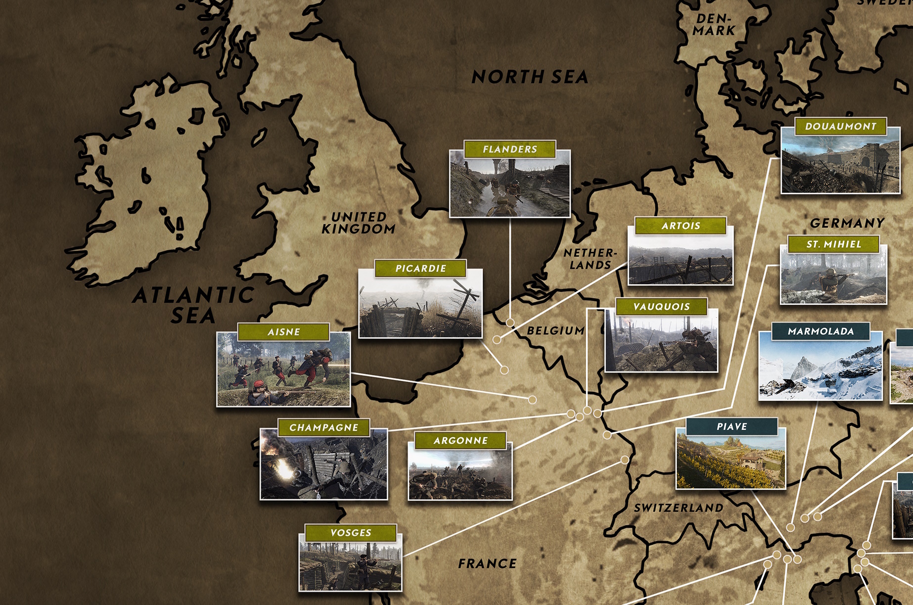 [i]We’ve been working on a grand map showing every battlefield in the series – here’s the Western Front part, with a bit of the Italian Front.[/i]