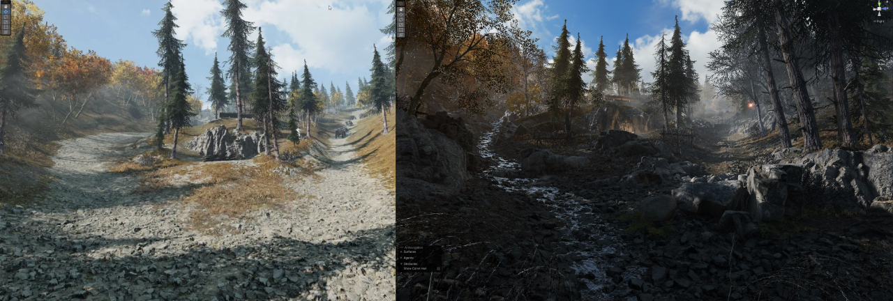 Then the dressing phase starts. Detailing the entire map, making sure everything is working as well like the HMG’s or wire cutting points. Most of my time is spent here, sculpting and painting Unity terrain, and placing assets. Here are a few before and after shots, from the blockout to the dressed version!
