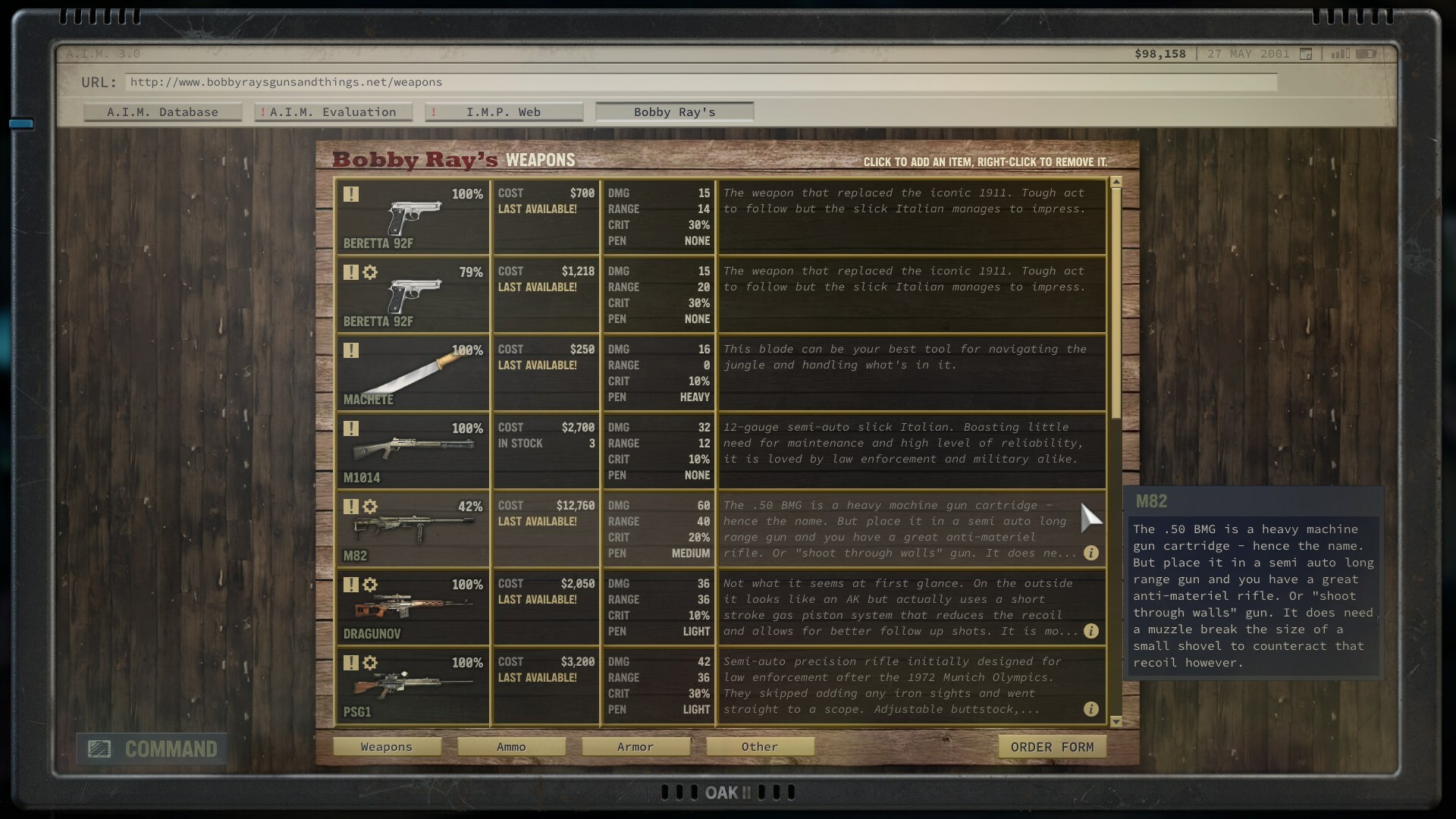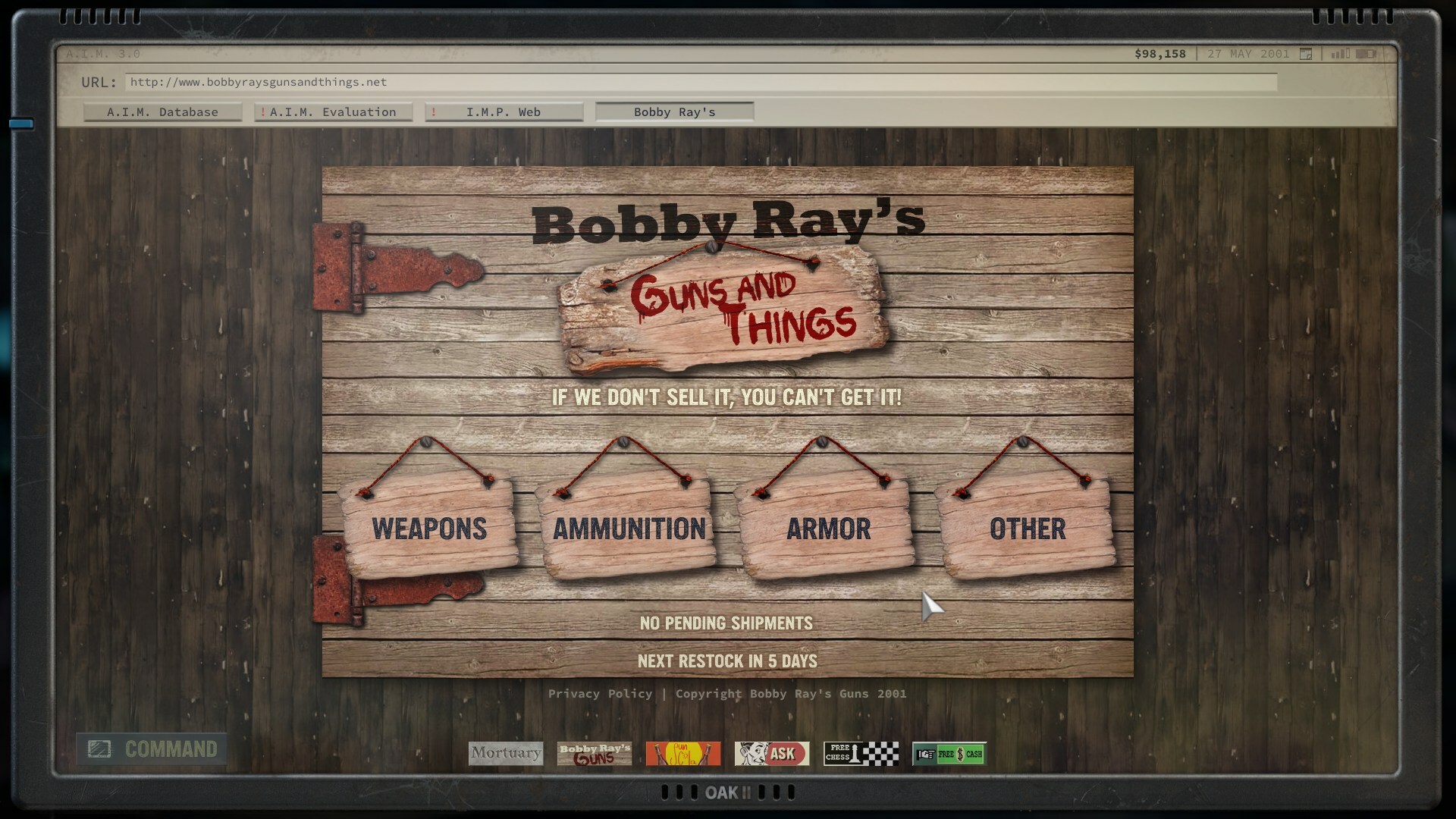 Bobby Ray’s Guns and Things is now able to process orders to the country of Grand Chien. Customers can now access www.bobbyraysgunsandthings.net online store through their PDA browser. There you can check out our wide selection of “guns and things” that you can order and get delivered to certain locations in the Adjani Valley.