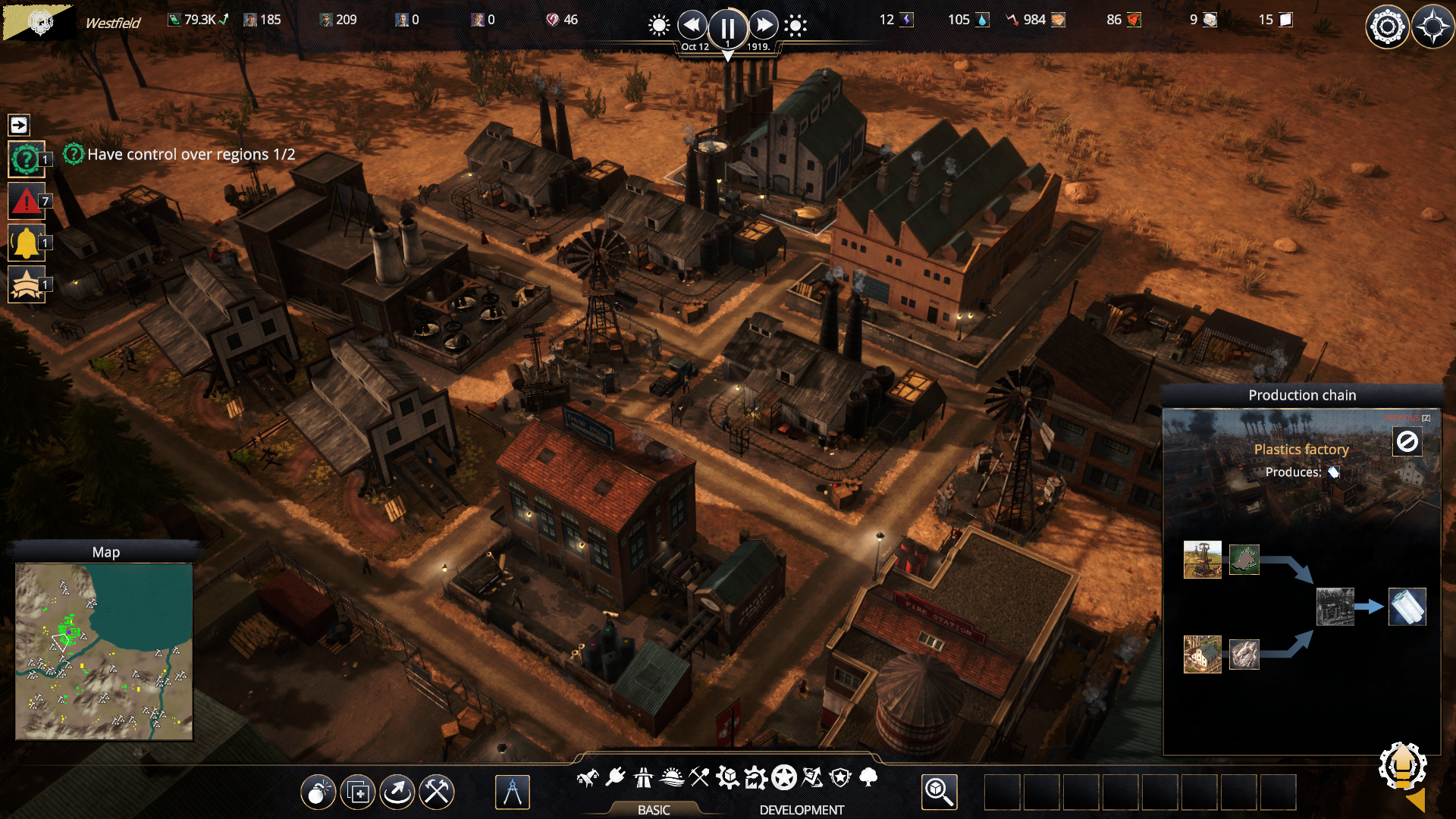 A production chain is a series of buildings that starts with one resource, refines it, adds more resources into the mix, and in the end, spits out a completely different resource. A chain can be as simple as one or two buildings to create construction plywood, or it can consist of a long series of branches, gradually zeroing in to create that light bomber you've been eyeing for your air force.