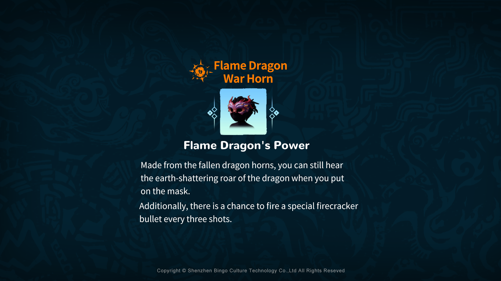 As a special edition mask making a dazzling debut in the Year of the Dragon version. Its colors and patterns are formed by absorbing the power of fireworks. Wearing the mask still hear the earth-shaking roar of the dragon. It may not boast powerful attribute bonuses, but you might appreciate its unique effects. When wearing the Flame Dragon Battle Horns, consider firing a few more pellets to experience its distinctive capabilities.