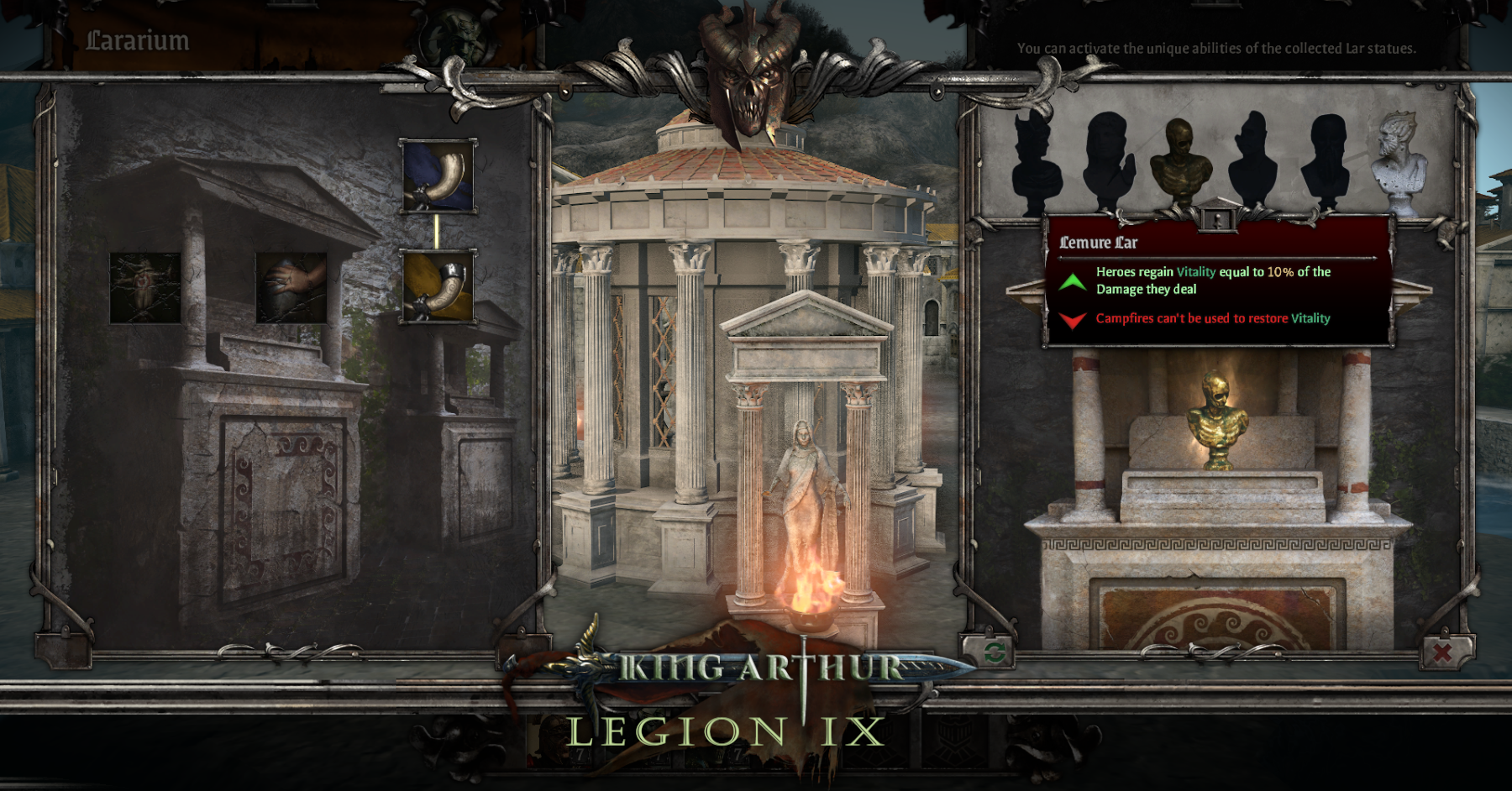 Here you will have six slots for Lares you can own, and one to be selected as active (two if you upgrade the building). Once these Lares are active, they will provide passive bonuses for all legionaries, such as applying some kind of extra damage type or gaining back resources like Vitality and AP during combat encounters.