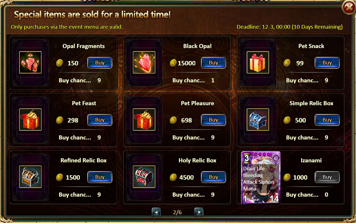 Consume 50,000 gold coins: Black Opal*1, Solar Chest (Legendary)*2, Pet Pleasure*5[/u]