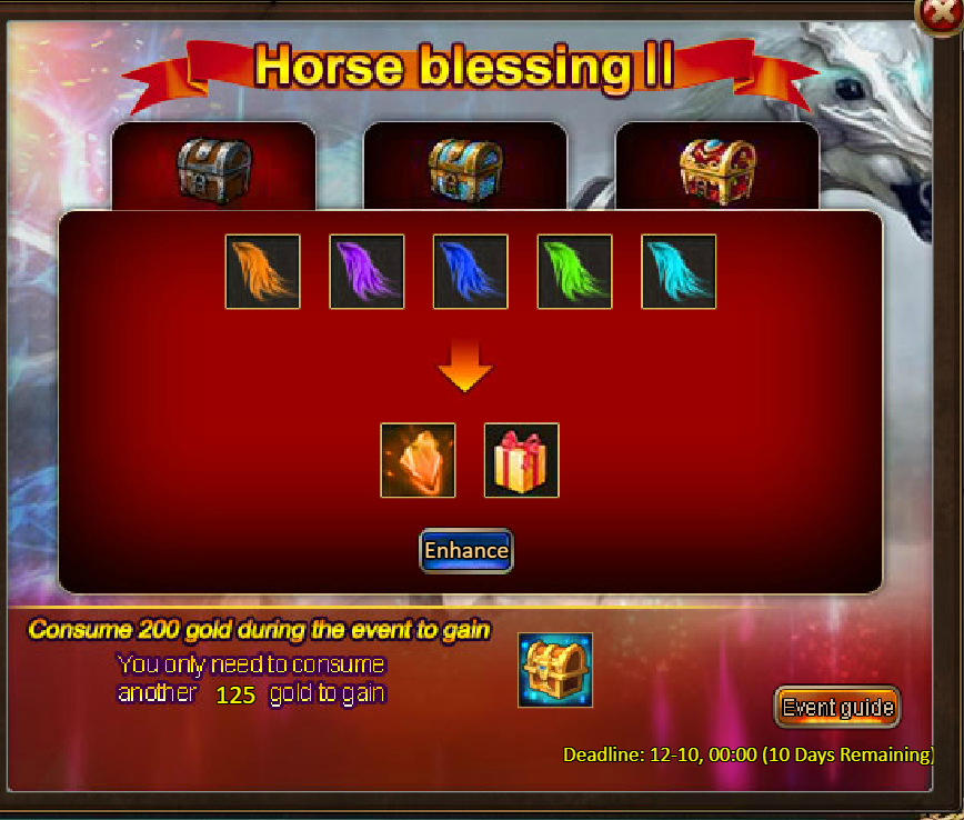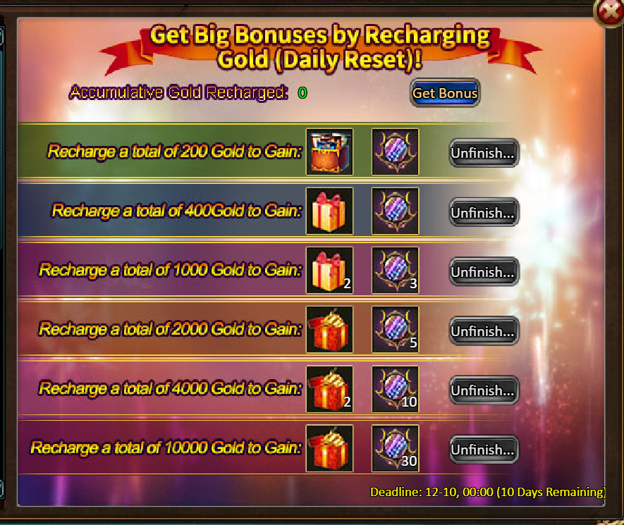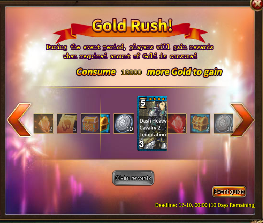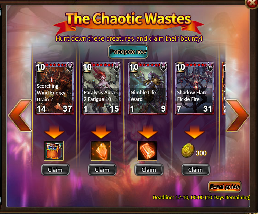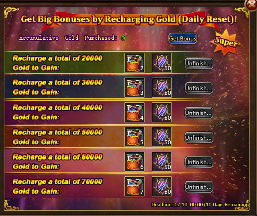 Consume 5,000 gold coins: Legendary Box*1, Fire Opal*2, Chaotic Wastes Ticket*5