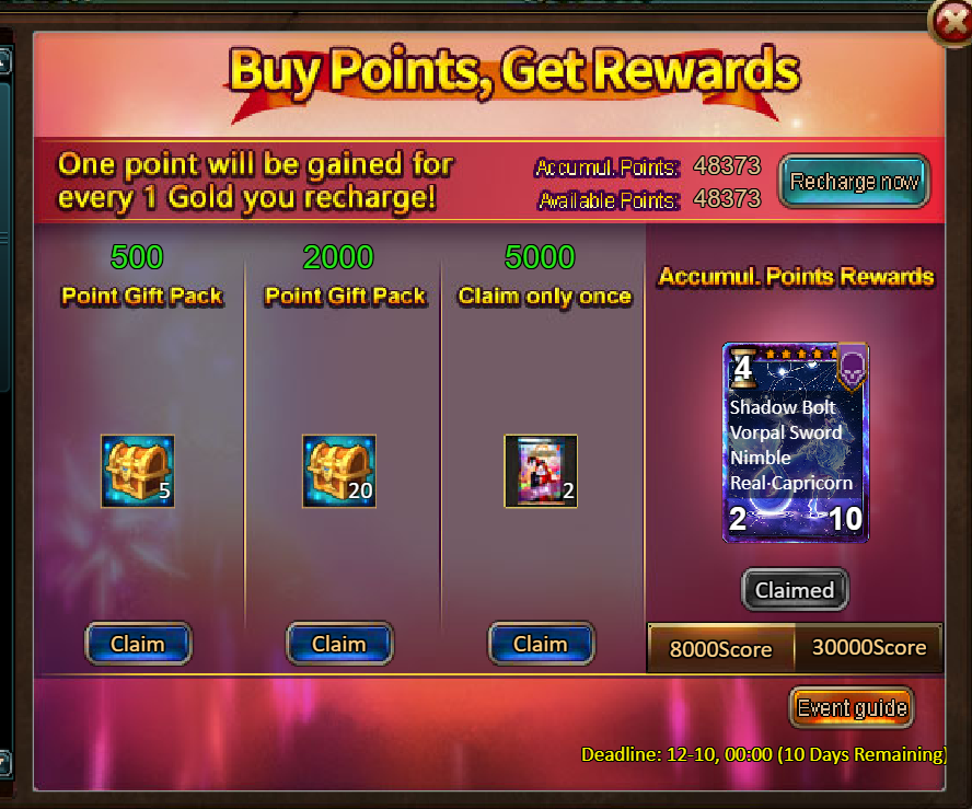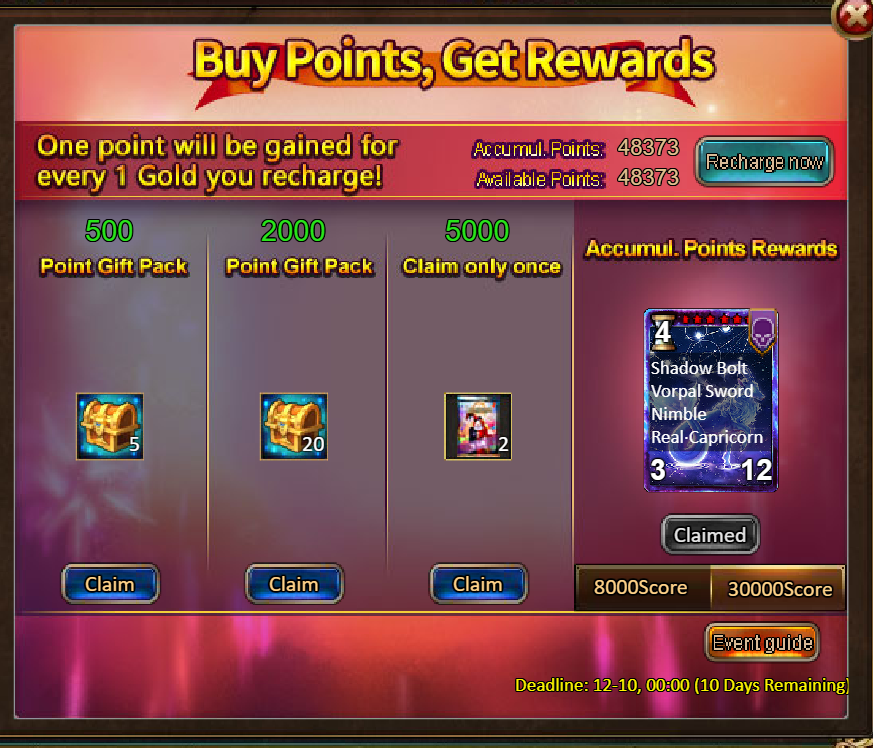 2.Buy Points, Get Rewards: 8000 - Capricorn (Legendary) / 30000 - Capricorn (Godlike)