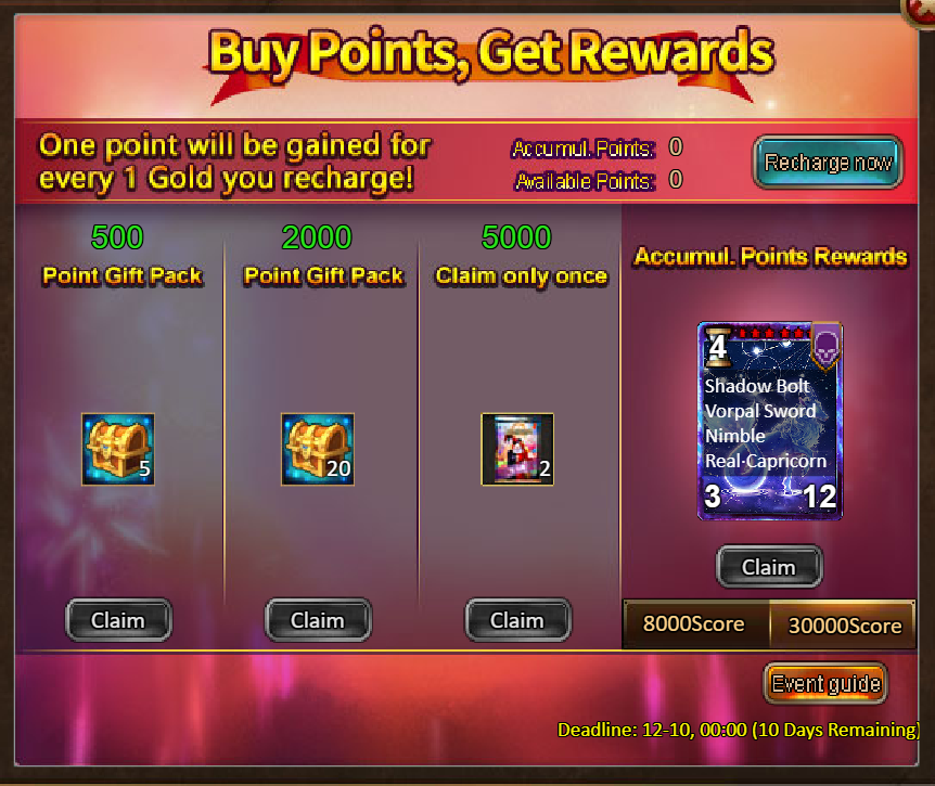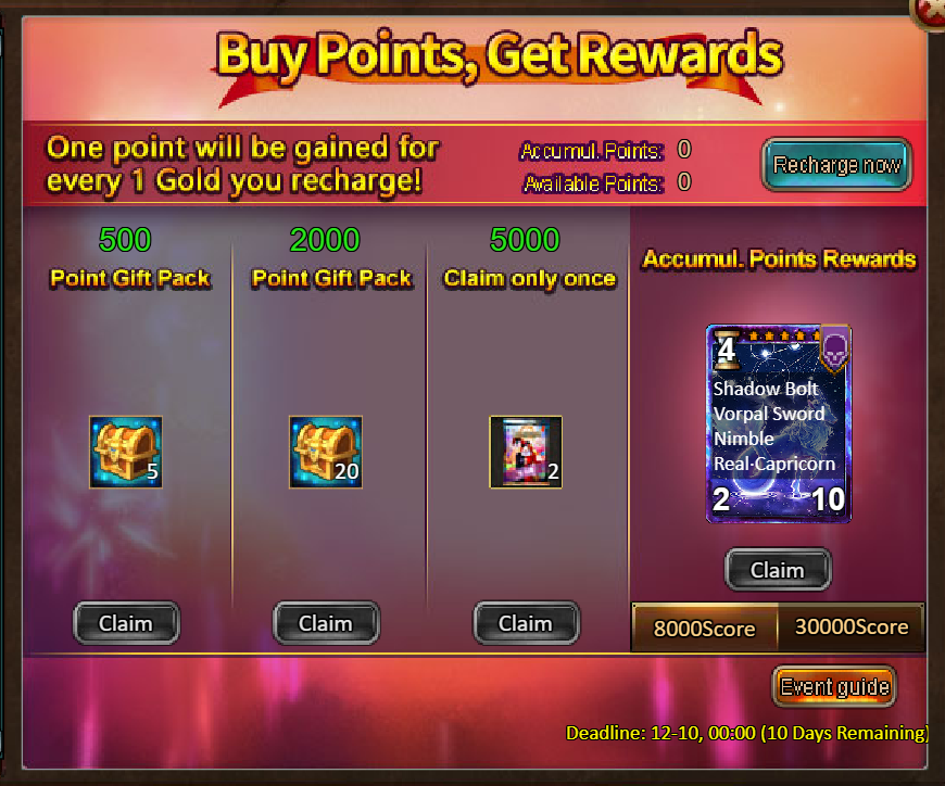 2.Buy Points, Get Rewards: 8000 - Capricorn (Legendary) / 30000 - Capricorn (Godlike)