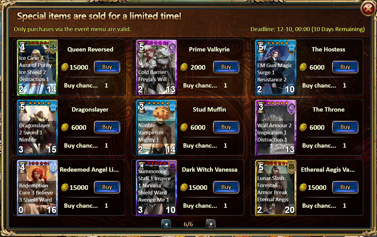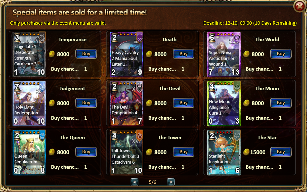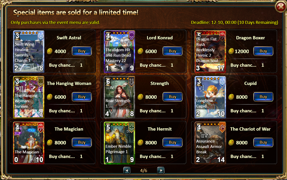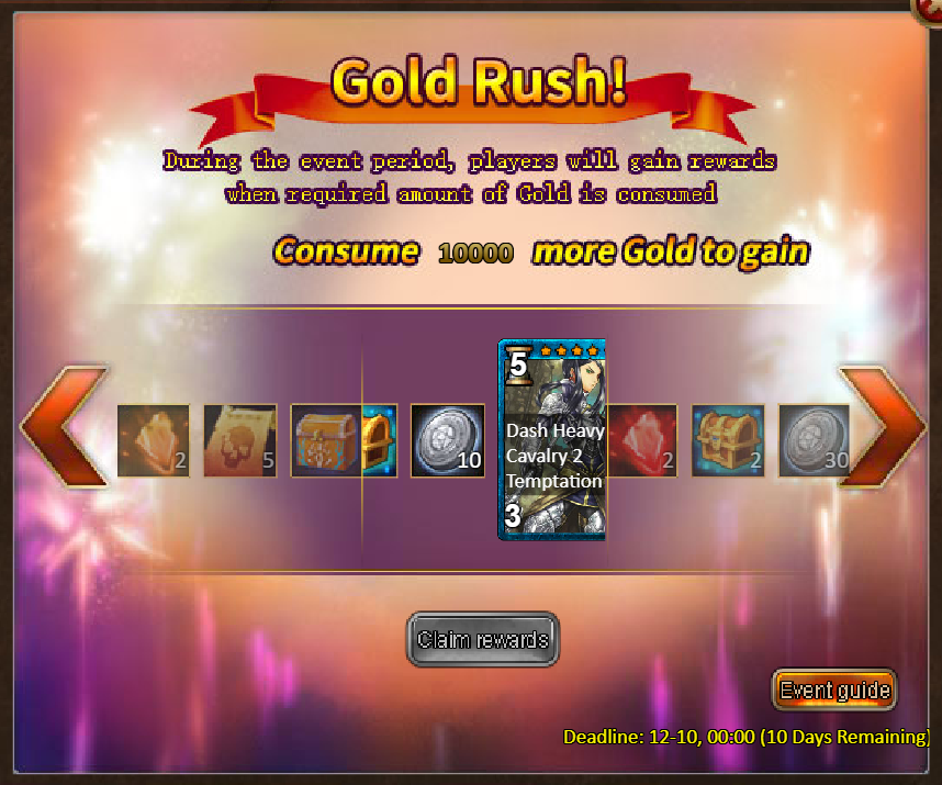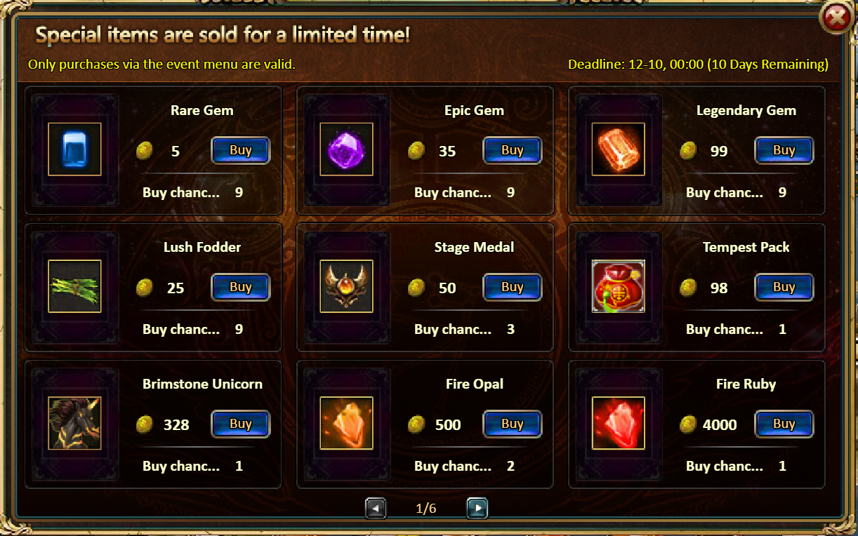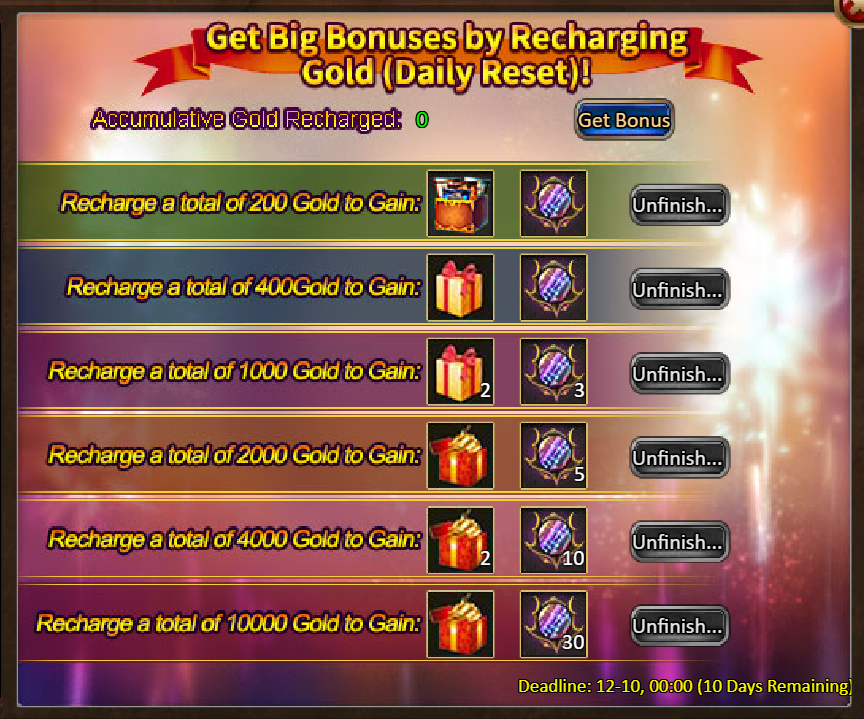 Consume 5,000 gold coins: Legendary Box*1, Fire Opal*2, Chaotic Wastes Ticket*5