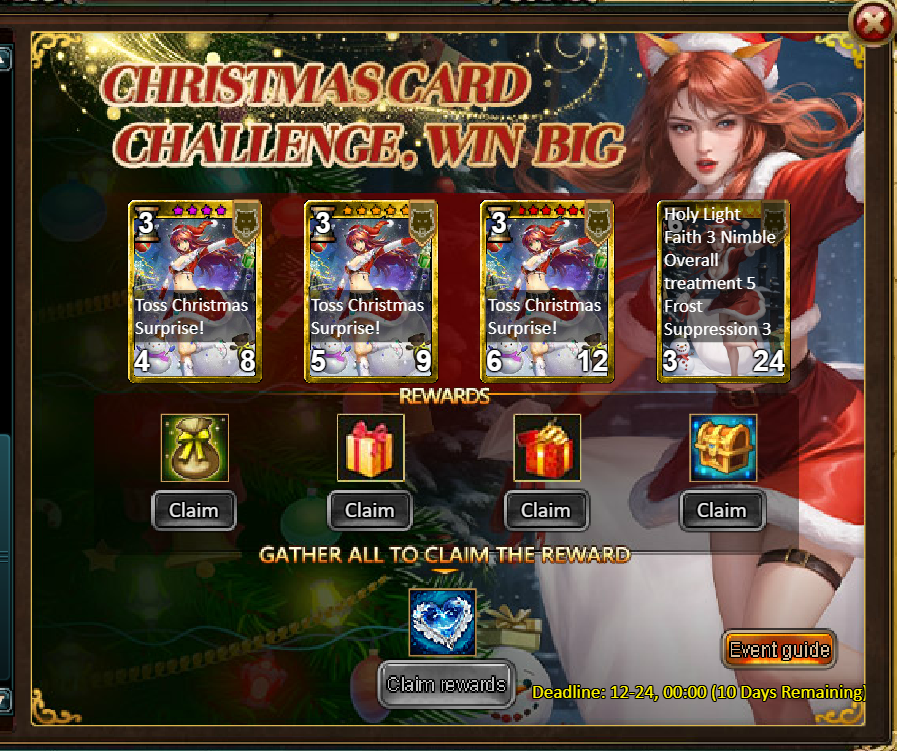 Players need to collect cards of different rarities (Epic, Legendary, Godlike, Awakened). Rewards can be earned at each stage of collection. Collect all the different rarities of the Christmas Girl Meryl’s cards to receive a generous grand prize.