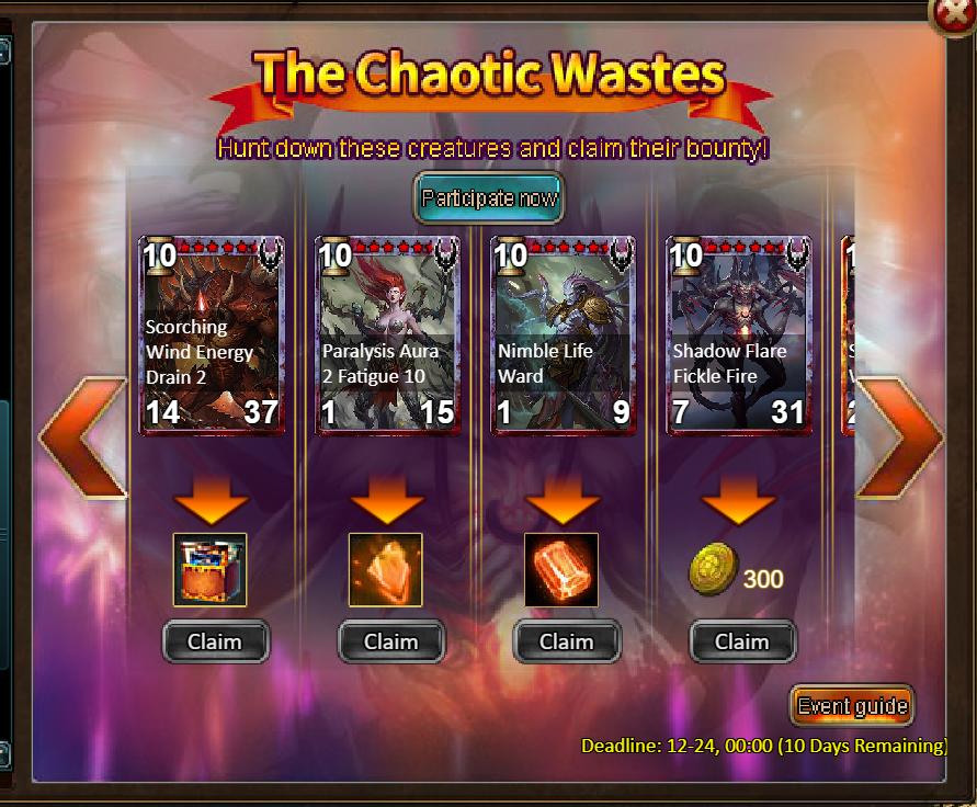 Consume 5,000 gold coins: Christmas Reindeer (7 days)*1, Fire Opal*2, Chaotic Wastes Ticket*5