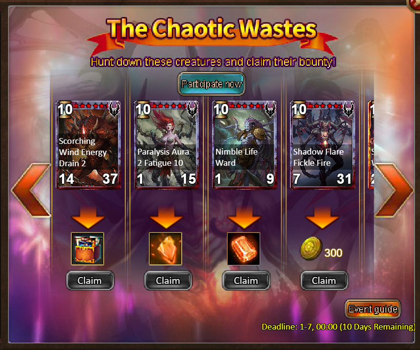 Consume 5,000 gold coins: Trickfire Zora (Legendary)*1, Fire Opal*2, Chaotic Wastes Ticket*5