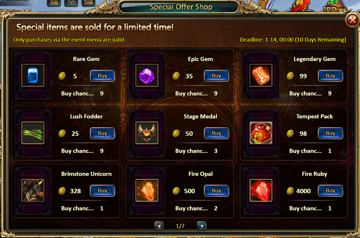 Consume 5,000 gold coins: Swift Saddle (7 days)*1, Fire Opal*2, Crystal Gift Pack*5