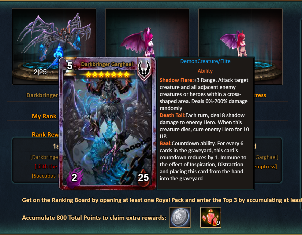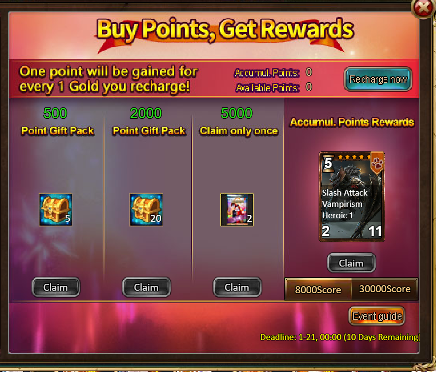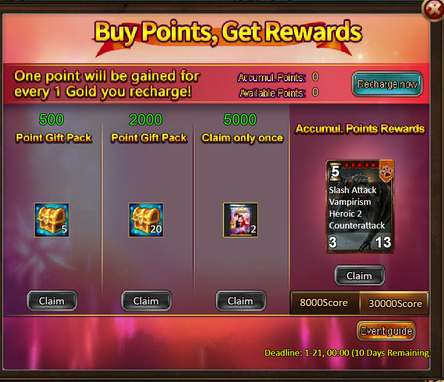 2.Buy Points, Get Rewards: 8000 - Camazotz (Legendary) / 30000 - Camazotz (Godlike)