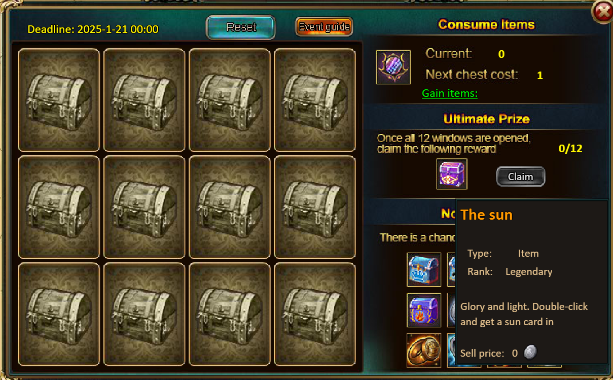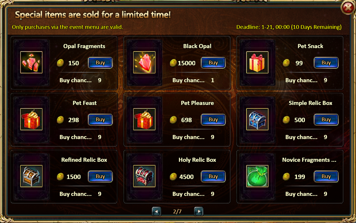 Consume 50,000 gold coins: Black Opal*1, Solar Chest (Legendary)*2, Pet Pleasure*5[/u]