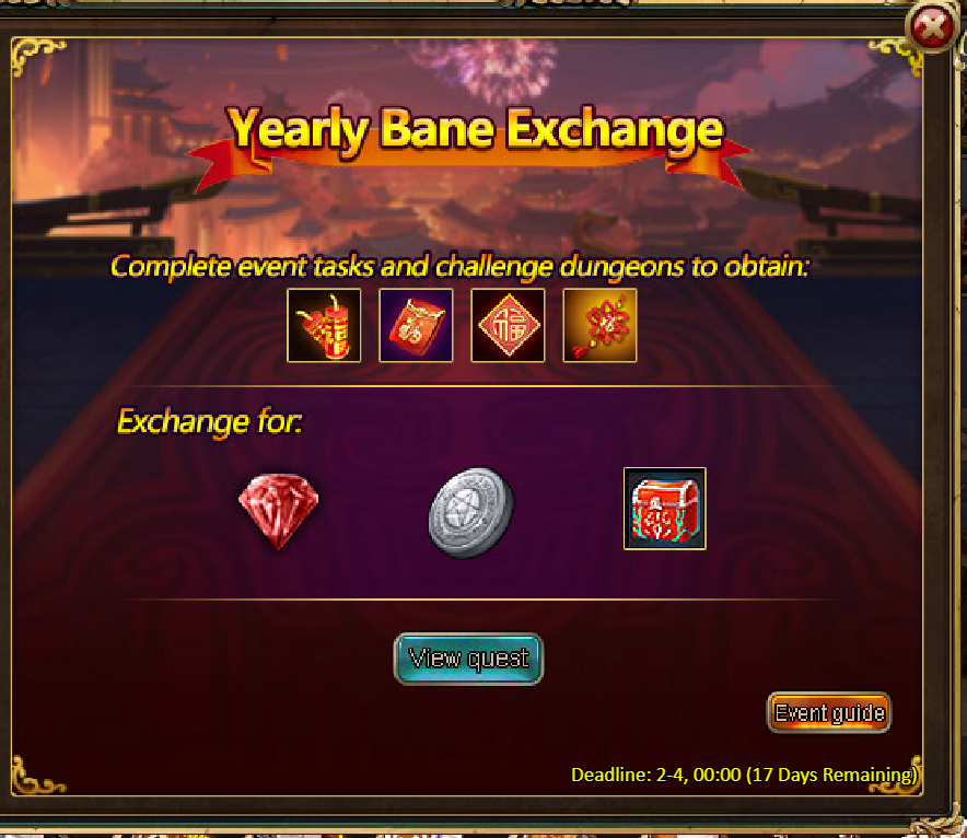 Players who have logged in since January 14th and have a character level of 45 or higher will receive: [u]Legendary Box*2 / Ticket Box*5 / Wish Coins*6 / Silver*1,880,000 / Tempest Pack*1[/u].