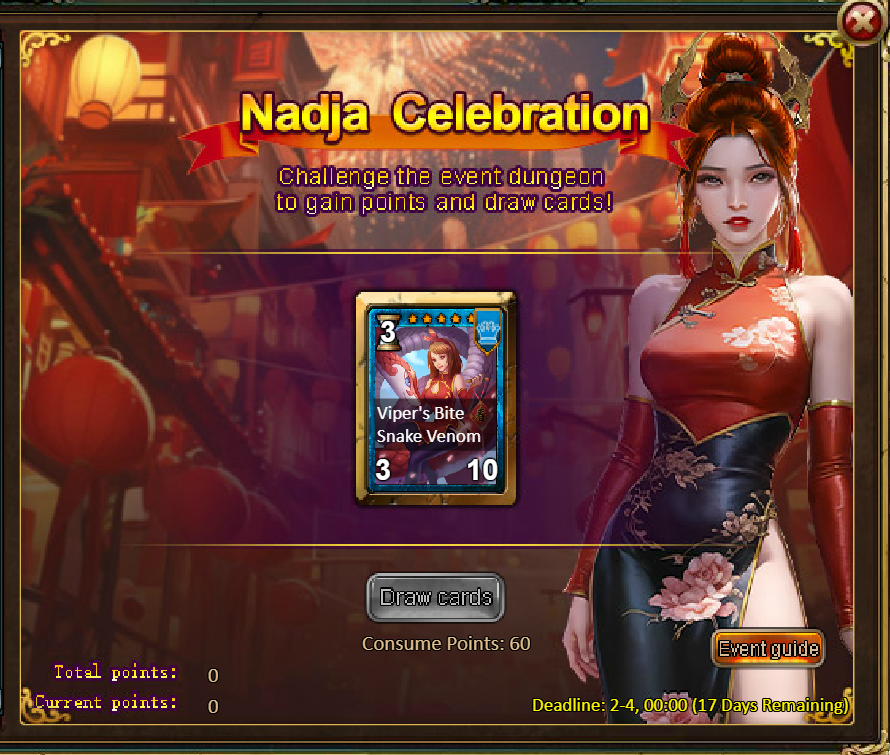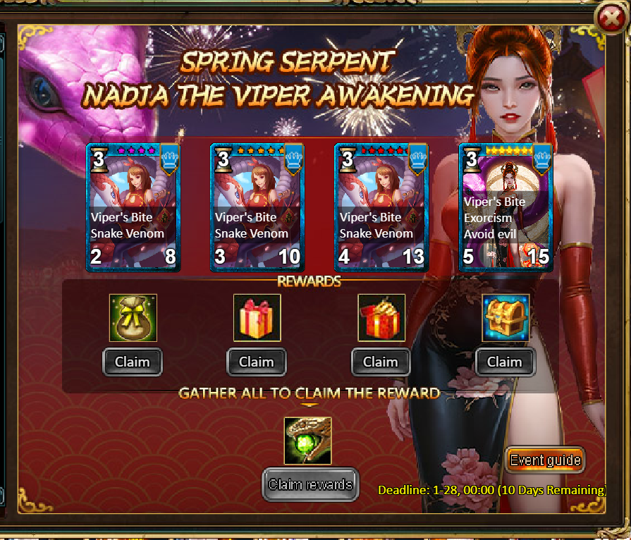 Event Goal: Players need to collect cards of different rarities (Epic, Legendary, Godlike, Awakened). Rewards will be given at each stage. Collect all the variants of Nadja the Viper to unlock amazing grand prizes!