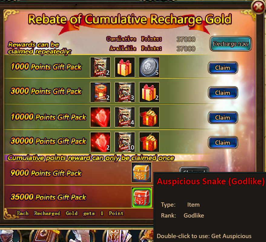 3.Recharge Big Rebates: 9000 - Auspicious Snake (Legendary) / 35000 - Auspicious Snake (Godlike)