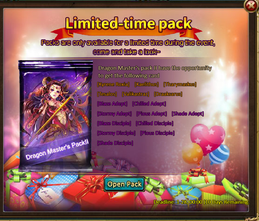 [u]10 packs of Dragon Master Pack II - Unicorn Mirager (Epic)*1 / Mystic Valley Ticket*3