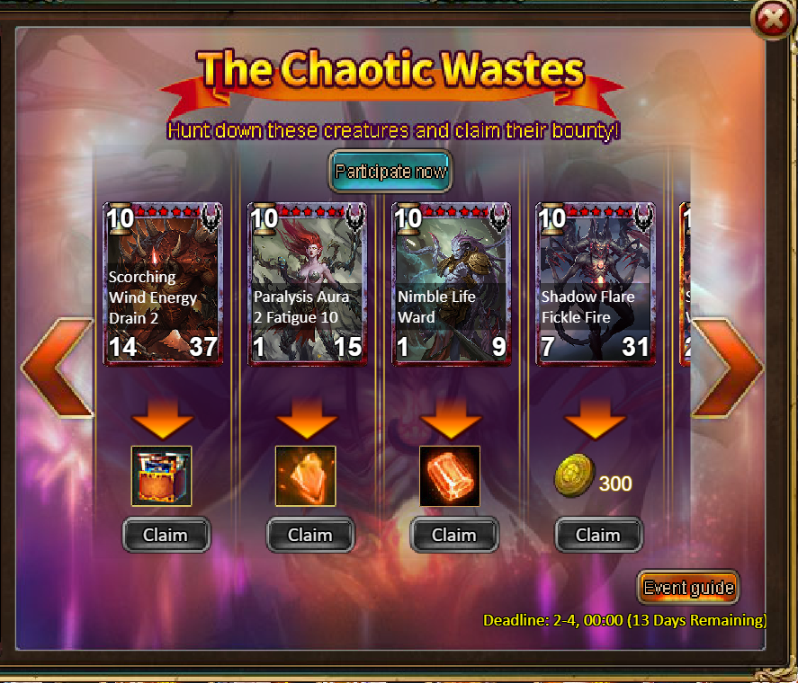 Consume 5,000 gold coins: Legendary Box*1, Fire Opal*2, Chaotic Wastes Ticket*5