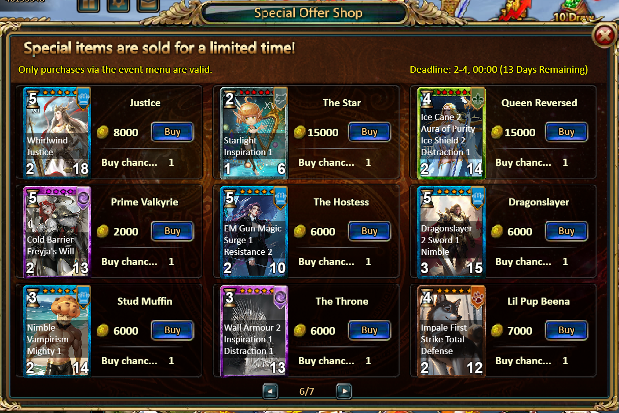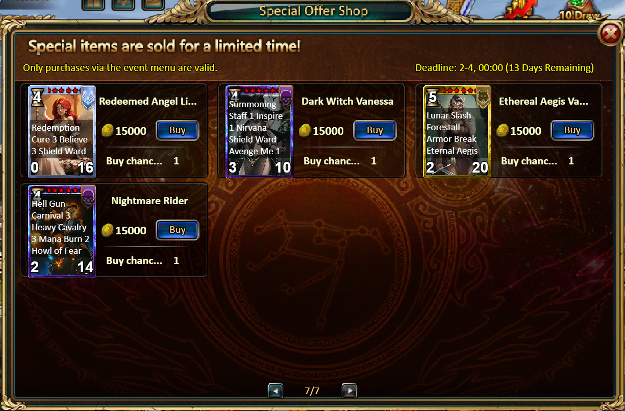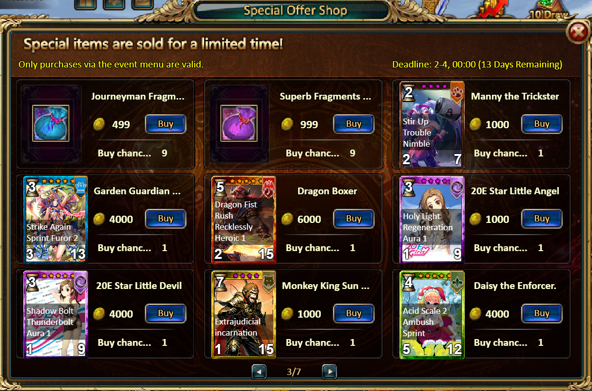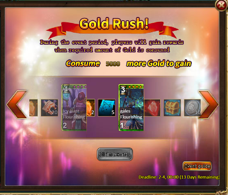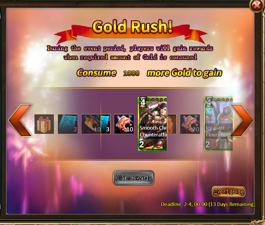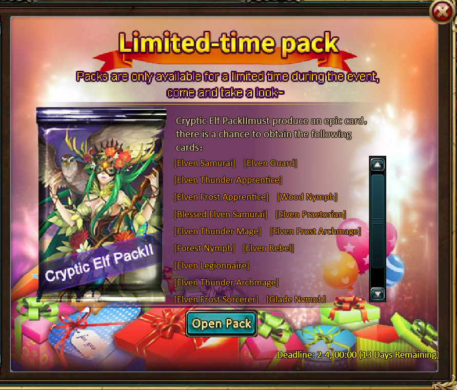 Consume 1,000 gold coins: Elf Swordmaster (Epic)*1, Mystic Valley Ticket*3, Tender Steak Fragment*20