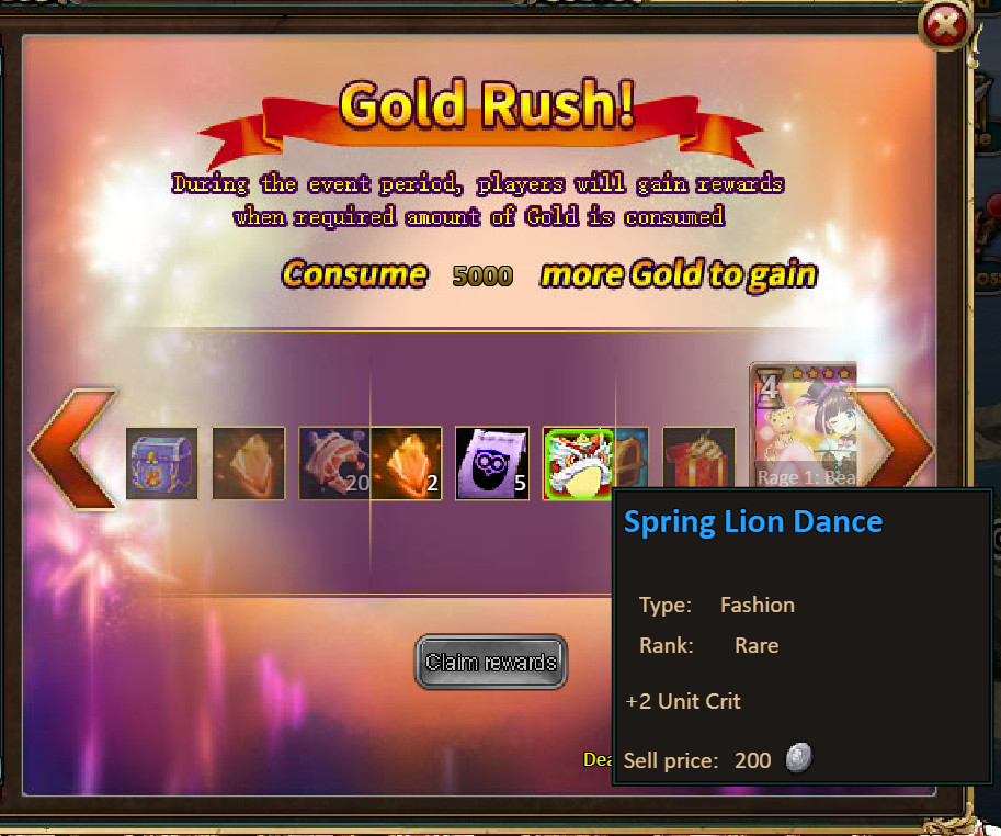 Consume 5,000 gold coins: Spring Lion Dance (Rare)*1, Fire Opal*2, Pet Magic Realm Ticket*5