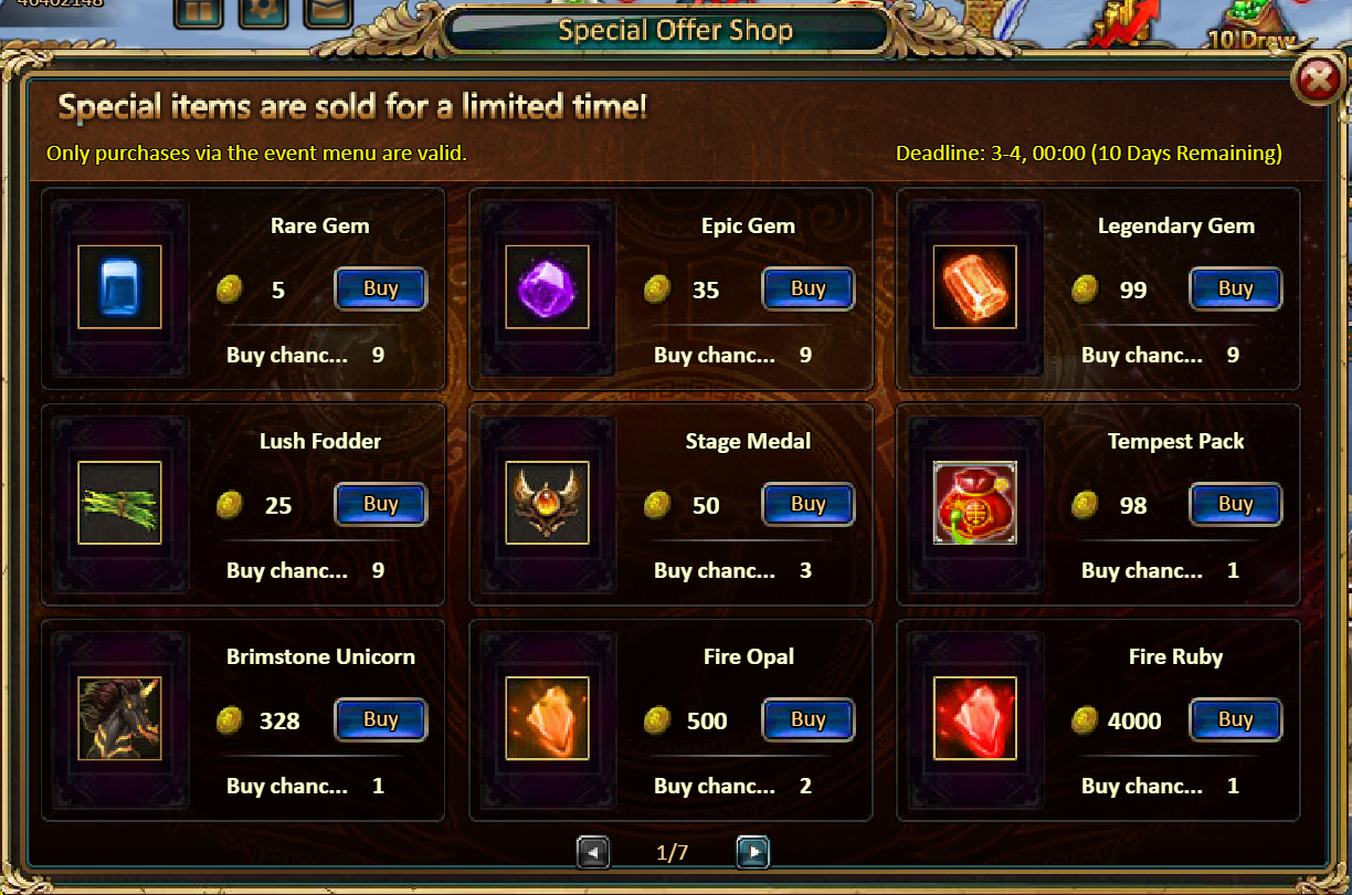 Consume 30,000 gold coins: Fire Ruby*2, Solar Chest (Legendary)*2, Pet Pleasure*3