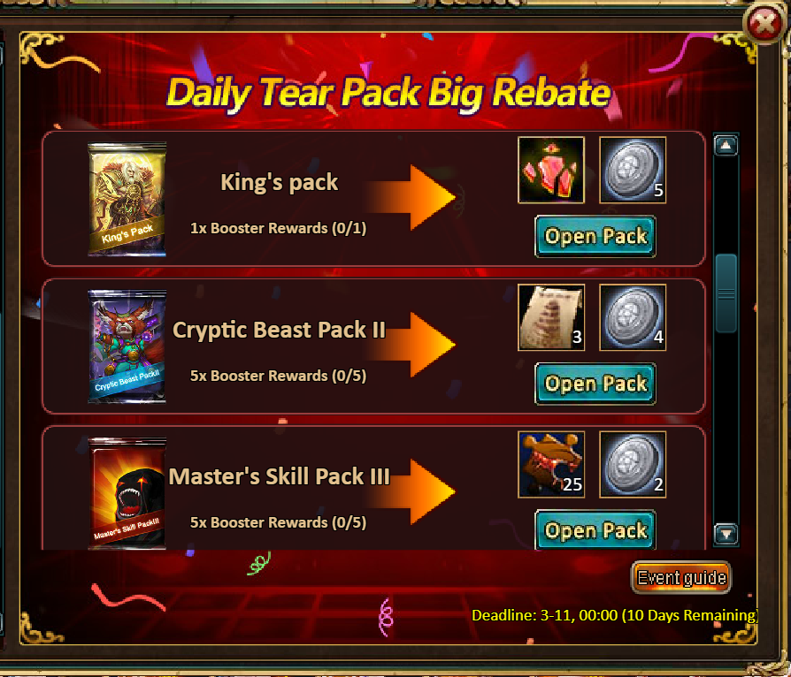 Consume 50,000 gold coins: Black Opal*1, Solar Chest (Legendary)*2, Pet Pleasure*5[/u]