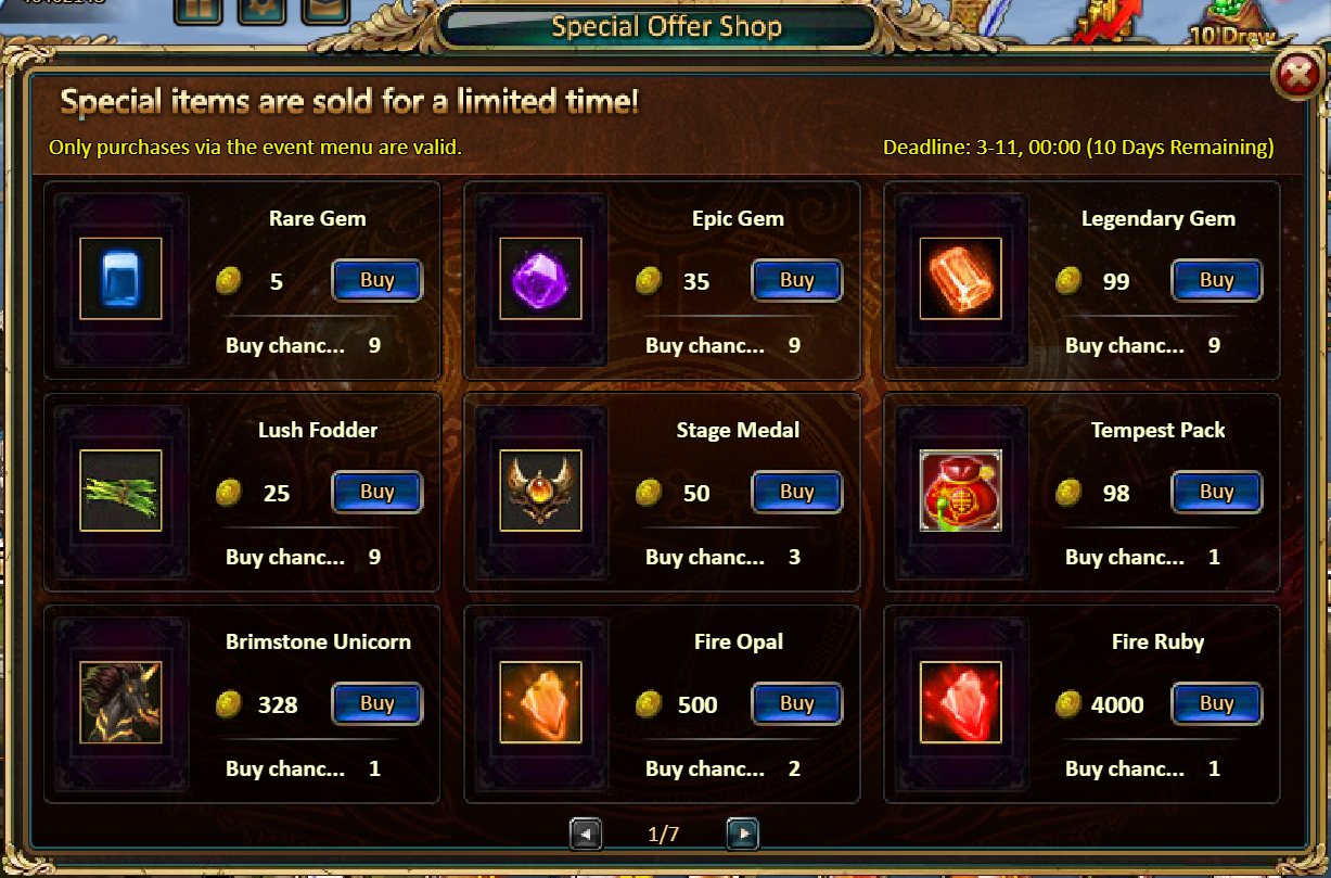 Consume 5,000 gold coins: Swift Saddle (7 days)*1, Fire Opal*2, Chaotic Wastes Ticket*5