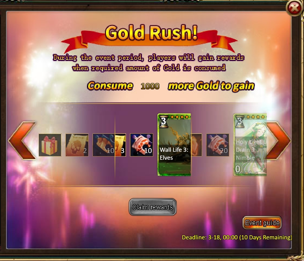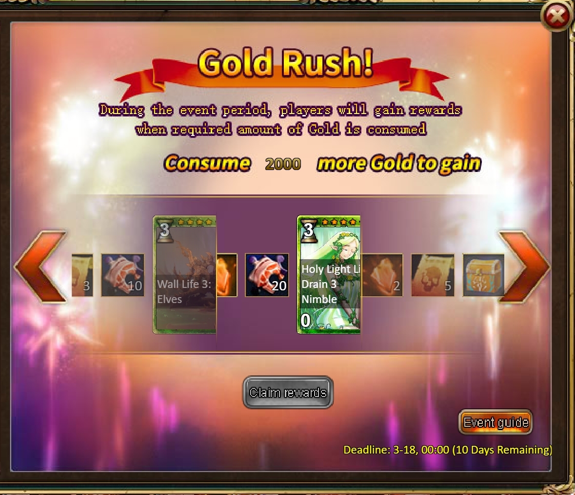 Consume 5,000 gold coins: Legendary Box*1, Fire Opal*2, Chaotic Wastes Ticket*5