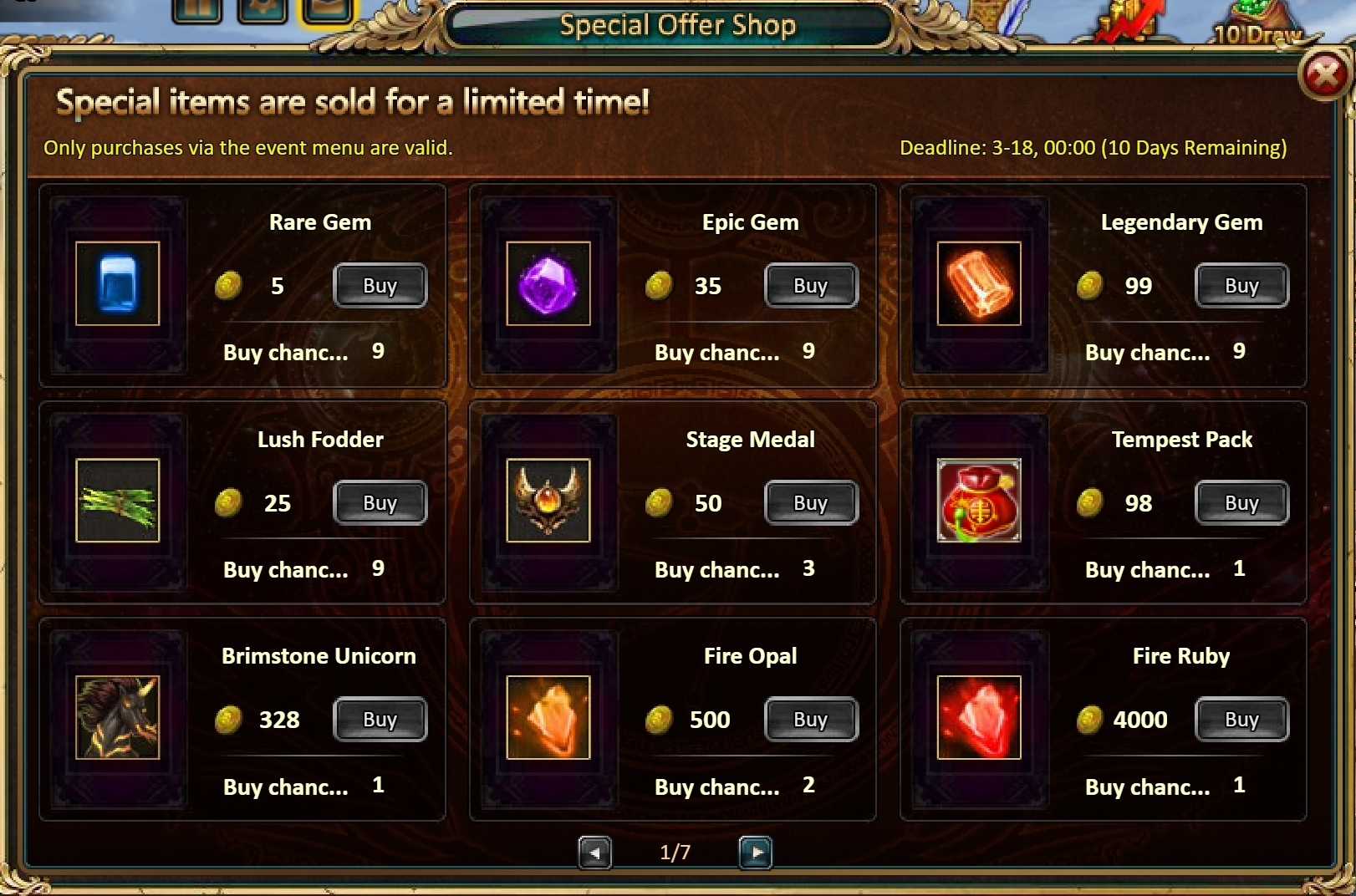 Consume 1,000 gold coins: Thronbush (Legendary)*1, Chaotic Wastes Ticket*3, Tender Steak Fragment*10