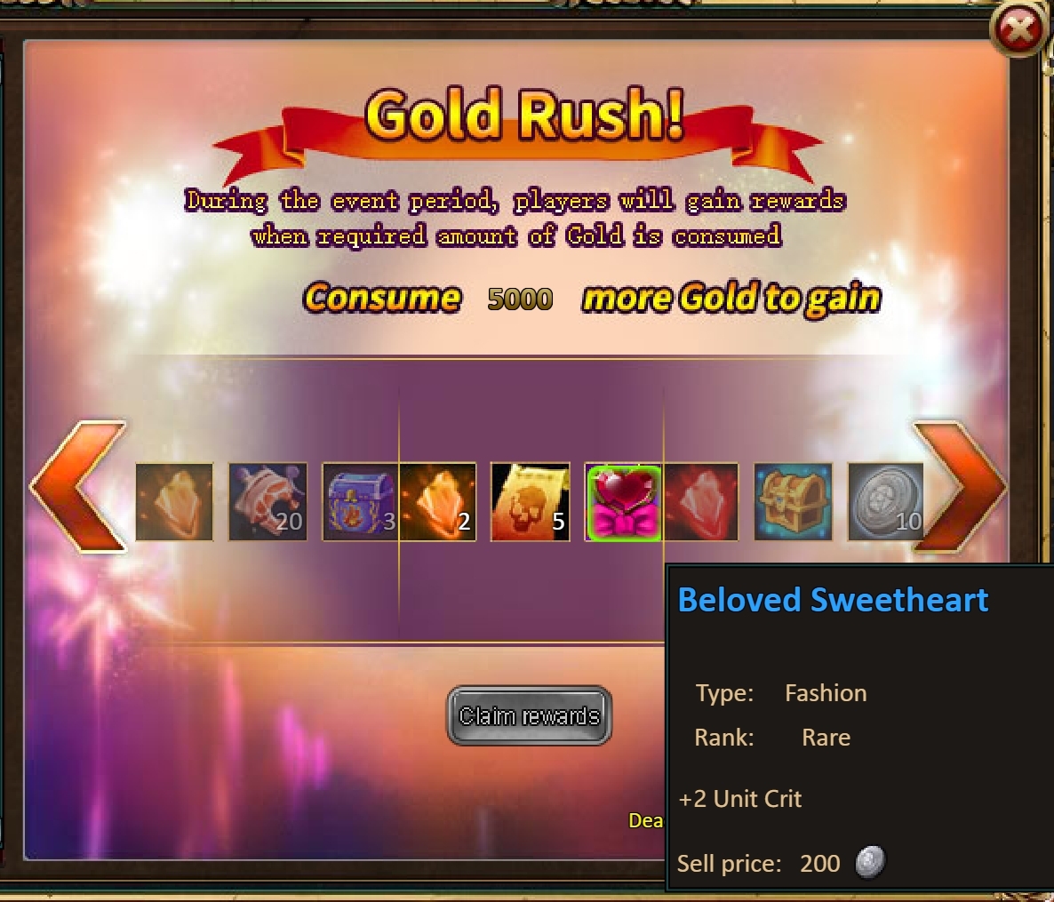 Consume 5,000 gold coins: Beloved Sweetheart (Rare)*1, Fire Opal*2, Chaotic Wastes Ticket*5