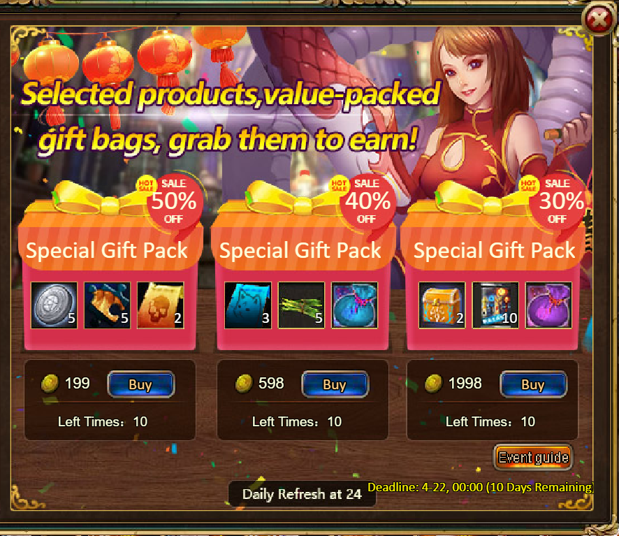 Consume 1,000 gold coins: Lunar Chest (Epic)*1, Mystic Valley Ticket*3, Tender Steak Fragment*10