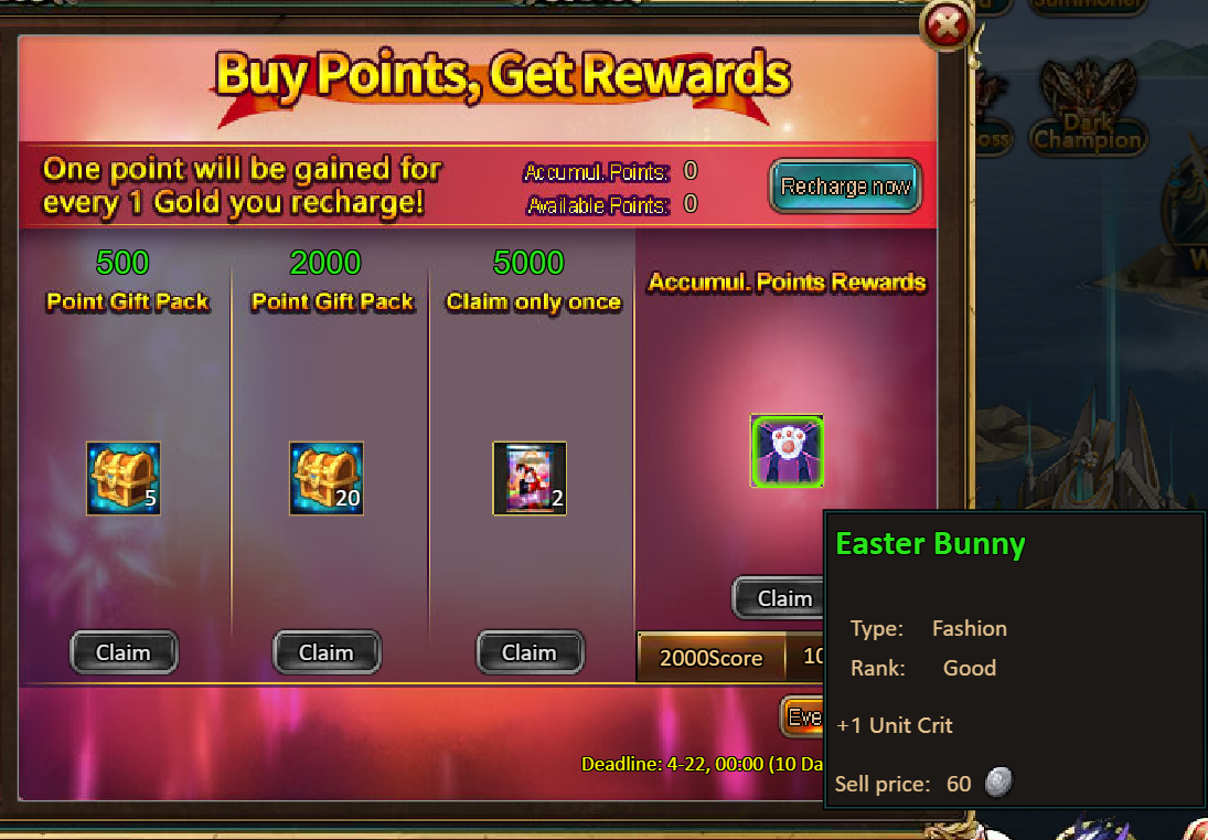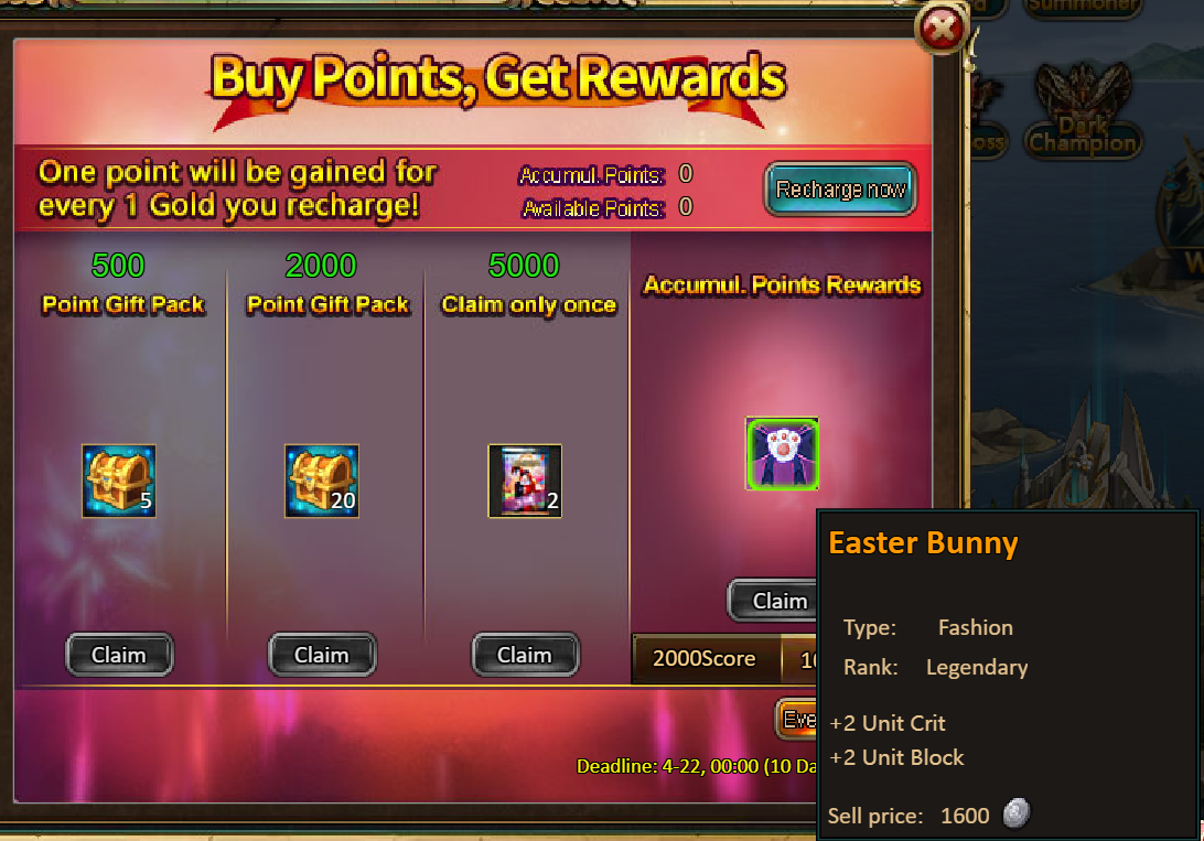 2.Buy Points, Get Rewards: 2000 - Easter Bunny (Good) / 10000 - Easter Bunny (Legendary)