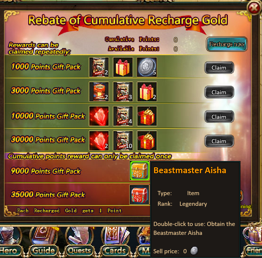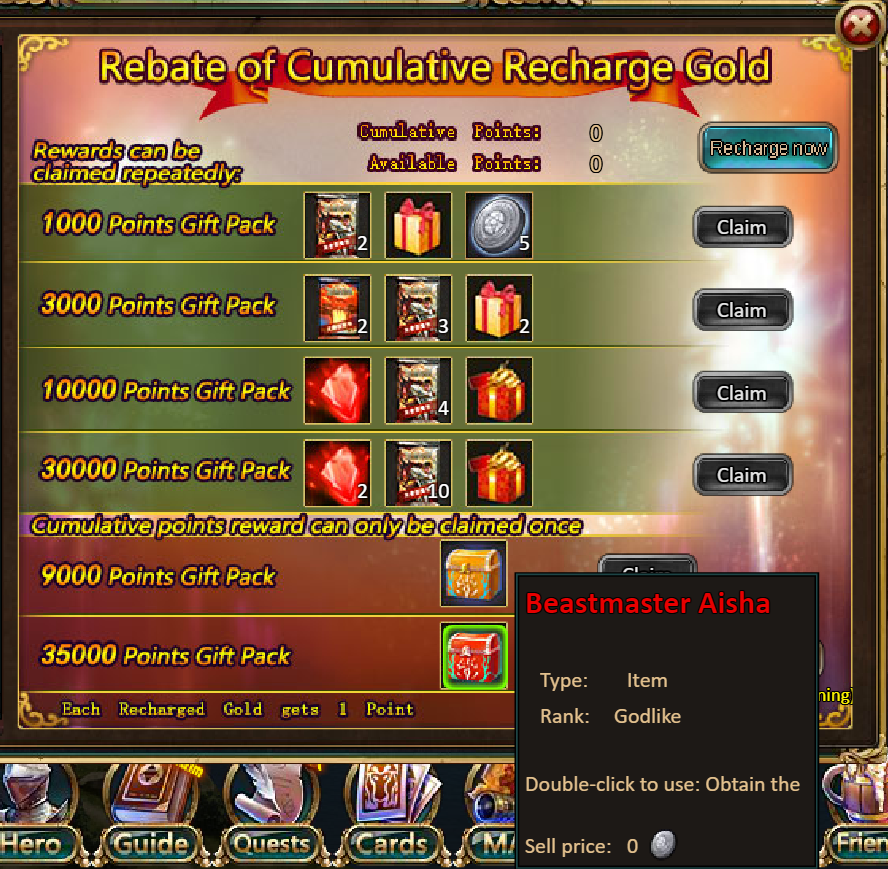 3.Recharge Big Rebates: 9000 - Beastmaster Aisha (Legendary) / 35000 - Beastmaster Aisha (Godlike)