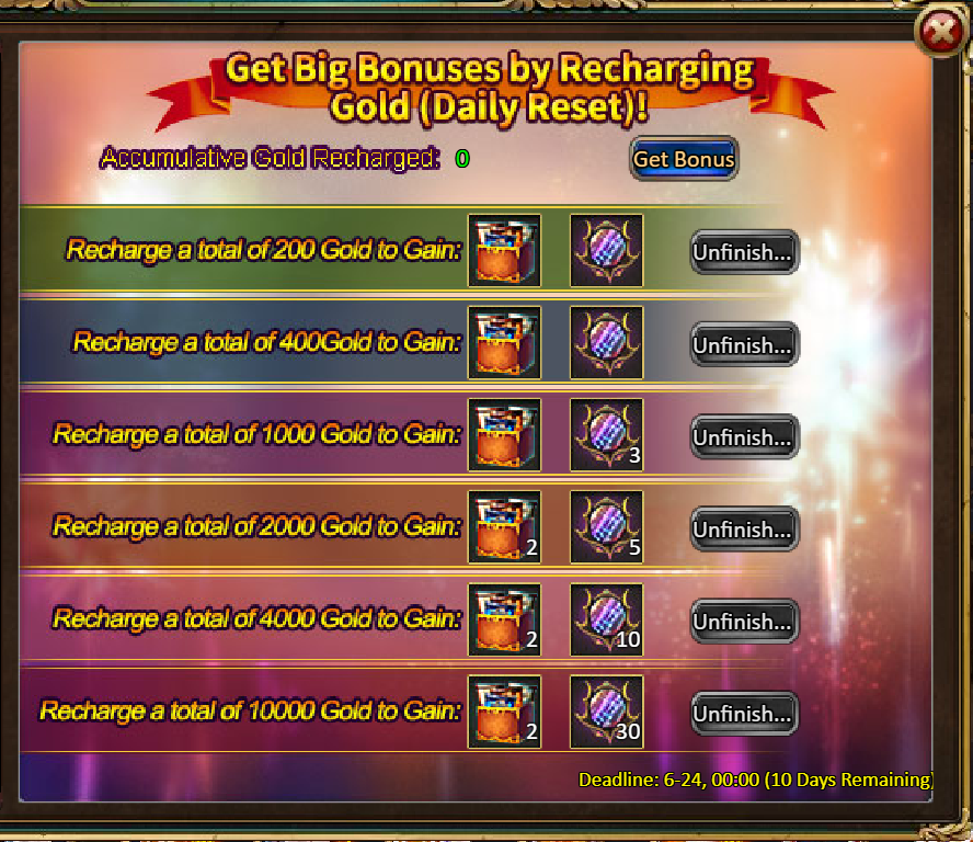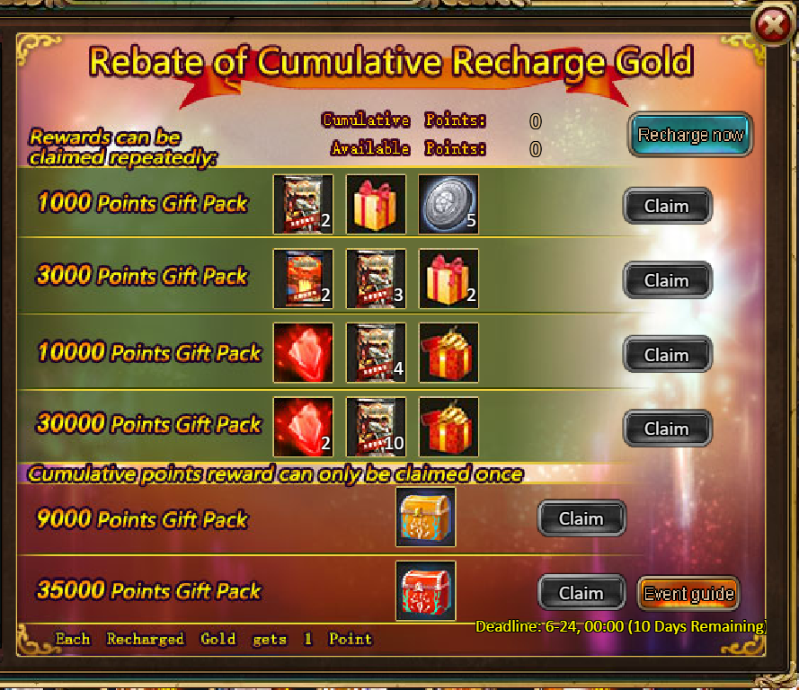 3.Recharge Big Rebates: 9000 - Idelr (Legendary) / 35000 - Idelr (Godlike)