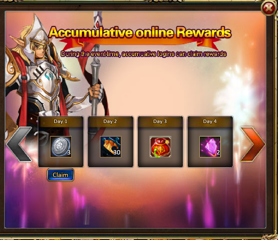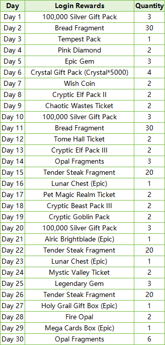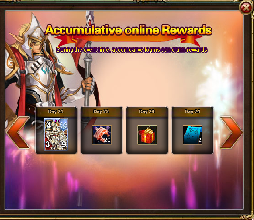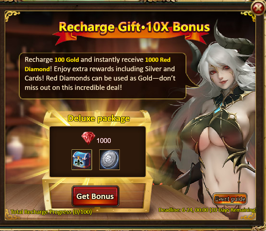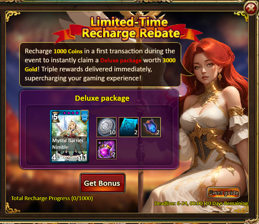 4.Limited-Time Recharge Reward: 1000-Princess Octavia (Epic), Tome Hall Ticket*2, Mystic Valley Ticket*2, Dark Champion Potion*2, Silver*100,000