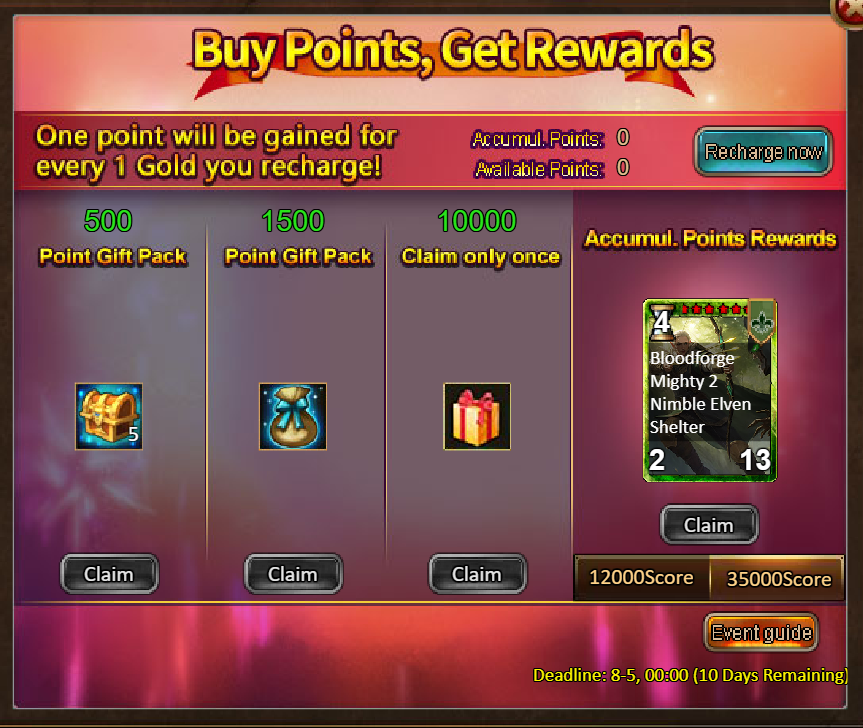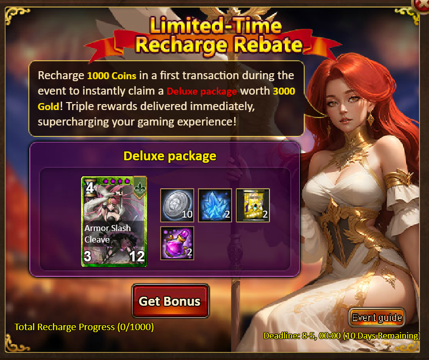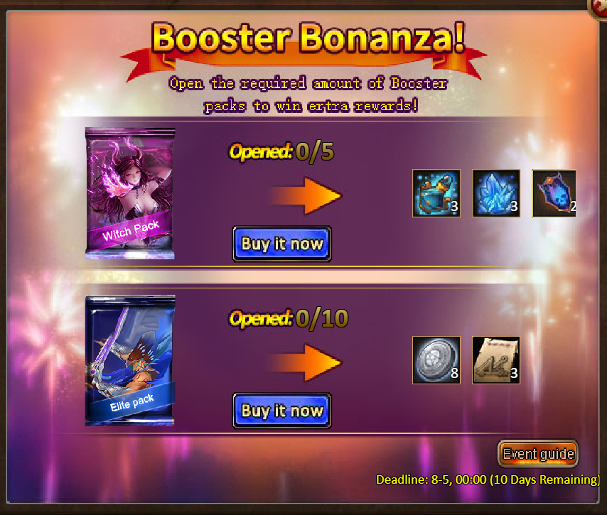Dear Players: We will conduct a maintenance update [b]from 16:00 to 18:00 pm on July 29, 2025, Beijing time.[/b] The specific maintenance progress will be advanced or postponed depending on the maintenance progress. Thanks for your understanding. During this period, the game will be inaccessible and we are sorry for the inconvenience caused. The following are the main contents of this maintenance: [b][Game Updates][/b] 1.New Ranger Skills added: [b]Multi-Layered Trap[/b] and [b]Carnage Feast[/b]! Unlock them by opening the [b]Master's Skill Pack V[/b]. 2.New card packs: [b]Cryptic Elf Pack IV[/b] and [b]Cryptic Halfblood IV[/b]! Opening guarantees a "[b]Incarnation[/b]" collection card. Available via the in-game Bazaar. [b][Event][/b] [b]1.Supremacy: Wisdom Juju 2.Red Diamond Storm: Red Diamond*2000 / Dragon Box*1 / Silver*50,000 3.Recharge Rebate: Toxic Morrigan (Epic)*1 / Silver*100,000 / Crystal Gift Pack*2 / Dark Champion Potion*2 / Master’s Skill Pack II*2 4.Buy Points, Get Rewards: 12000 - Bloodforge (Legendary) / 35000 - Bloodforge (Godlike) 5.Cumulative Gold Rebate: 9000 - Myconid (Legendary) / 35000 - Myconid (Godlike) 6.Daily Tear Pack Big Rebate 7.Value Rebates 8.Directory of Myths (Xihai Lunu) 9.Event of Football 10.Gold Rush (Weekly Event)[/b] [u]Consume 10,000 gold coins: Real·Virgo (Legendary)*1, Solar Chest (Legendary)*2. Pet Pleasure*1 Consume 30,000 gold coins: Fire Ruby*2, Solar Chest (Legendary)*3, Silver*3,000,000 Consume 50,000 gold coins: Black Opal*1, Solar Chest (Legendary)*4, Pet Pleasure*5 Consume 70,000 gold coins: Fire Ruby*2, Solar Chest (Legendary)*5, Silver*4,000,000 Consume 90,000 gold coins: Black Opal*1, Solar Chest (Legendary)*6, Silver*5,000,000[/u] [b]11.Spend Daily, Get Rewards[/b] [u]Consume 100 gold coins: Fusion Catalyst*1, Silver*10,000, Tower Ticket*3 Consume 500 gold coins: Human Box (Rare)*1, Fusion Catalyst*2, Mystical Valley Ticket*1 Consume 1,000 gold coins: Mystical Valley Ticket*2, Angel Box (Rare)*1, Silver*50,000 Consume 2,000 gold coins: Lunar Chest (Epic)*1, Fodder (Legendary)*10, Pet Snack*1 Consume 5,000 gold coins: Mystical Valley Ticket*3, Unbound Skill Tome Shard (Good)*5, Fire Opal*1 Consume 10,000 gold coins: Fire Ruby*1, Advanced Fusion Catalyst*1, Silver*1,000,000[/u] [b]12.Pack (Limited Time Event) - Booster Bonanza[/b] [u]10 packs of Victory Pack - Black Opal*1 / Silver*1,500,000 20 packs of Master’s Skill Pack V - Master’s Skill Pack V*10 / Silver*1,000,000 20 packs of Cryptic Halfblood Pack IV - Opal Fragment*9 / Silver*500,000 / Advanced Awakened Fragment Pack*2 10 packs of Cryptic Elf Pack IV - Lunar Chest (Epic)*2 / Silver*500,000 / Fire Opal*1 5 packs of Witch Pack - Elixir of Energy (10 Points)*3 / Crystal Gift Pack*3 / Tome Hall Ticket*2 10 packs of Elite Pack - Assembly Order*3 / Silver*80,000[/u] [b]13.Mystical Valley 14.Ascension Tower-Overseer 15.Ancient Den[/b] See the pictures for details. The event content is subject to the game content. The official has the final right of interpretation. [b](Unique: When multiple "Stasis" effects are present, only the one with the highest probability takes effect.) ("Stasis" only affects enemy Creature. Hero Skills, Equipment, and Pets are not affected.)[/b]