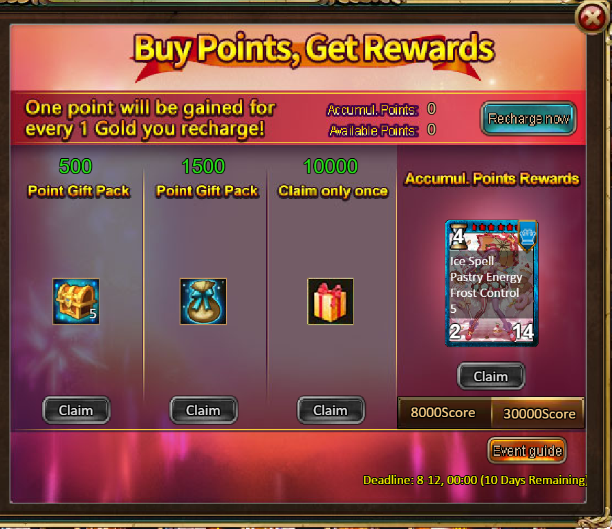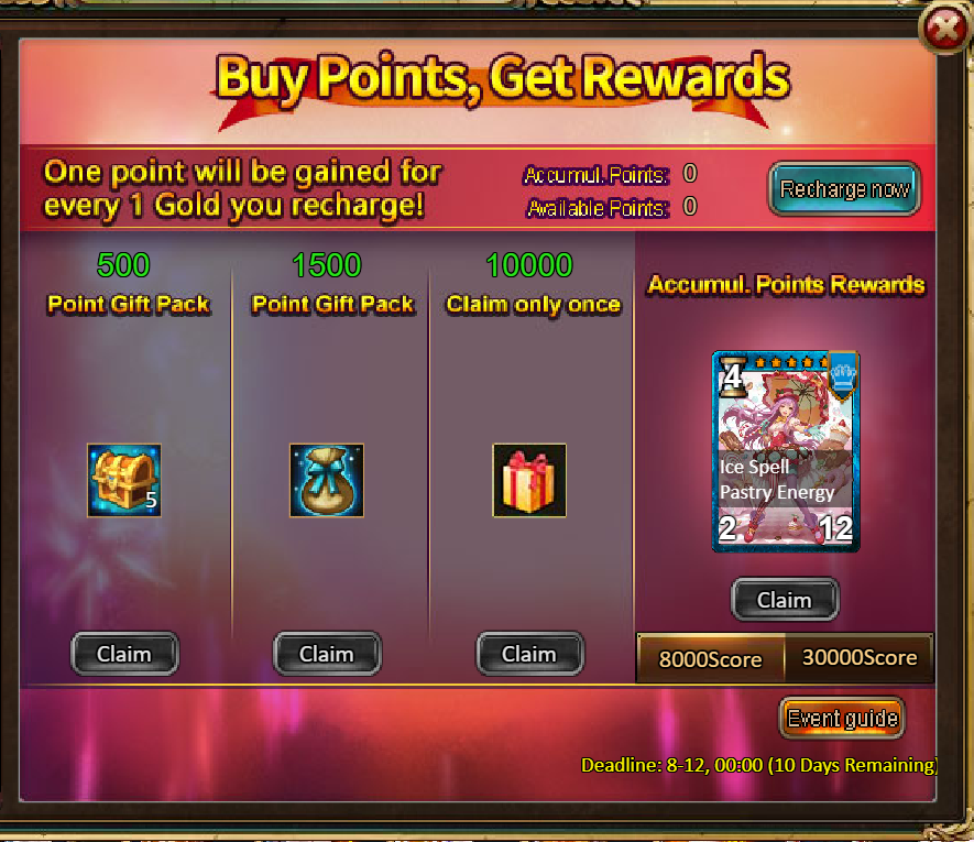 4.Buy Points, Get Rewards: 8000 - Pastry Bingyue (Legendary) / 30000 - Pastry Bingyue (Godlike)