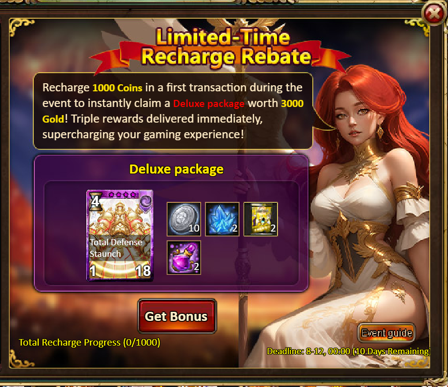 3.Recharge Rebate: Earth Ohuis (Epic) / Silver*100,000 / Maste’s Skill Pack II*2 / Dark Champion Potion*2 / Crystal Gift Box*2