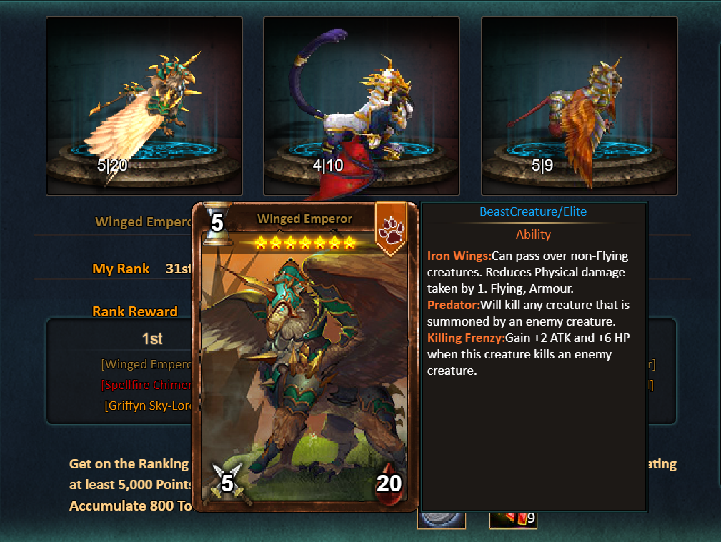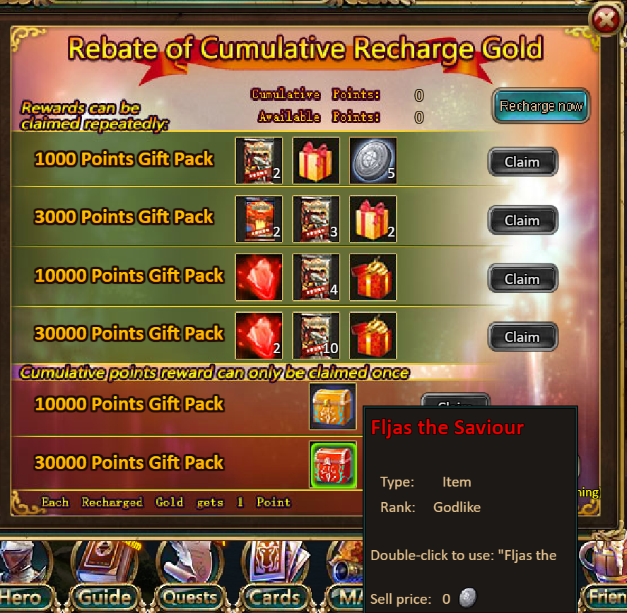 5.Cumulative Gold Rebate: 10000 - Fljas the Saviour (Legendary) / 35000 - Fljas the Saviour (Godlike)
